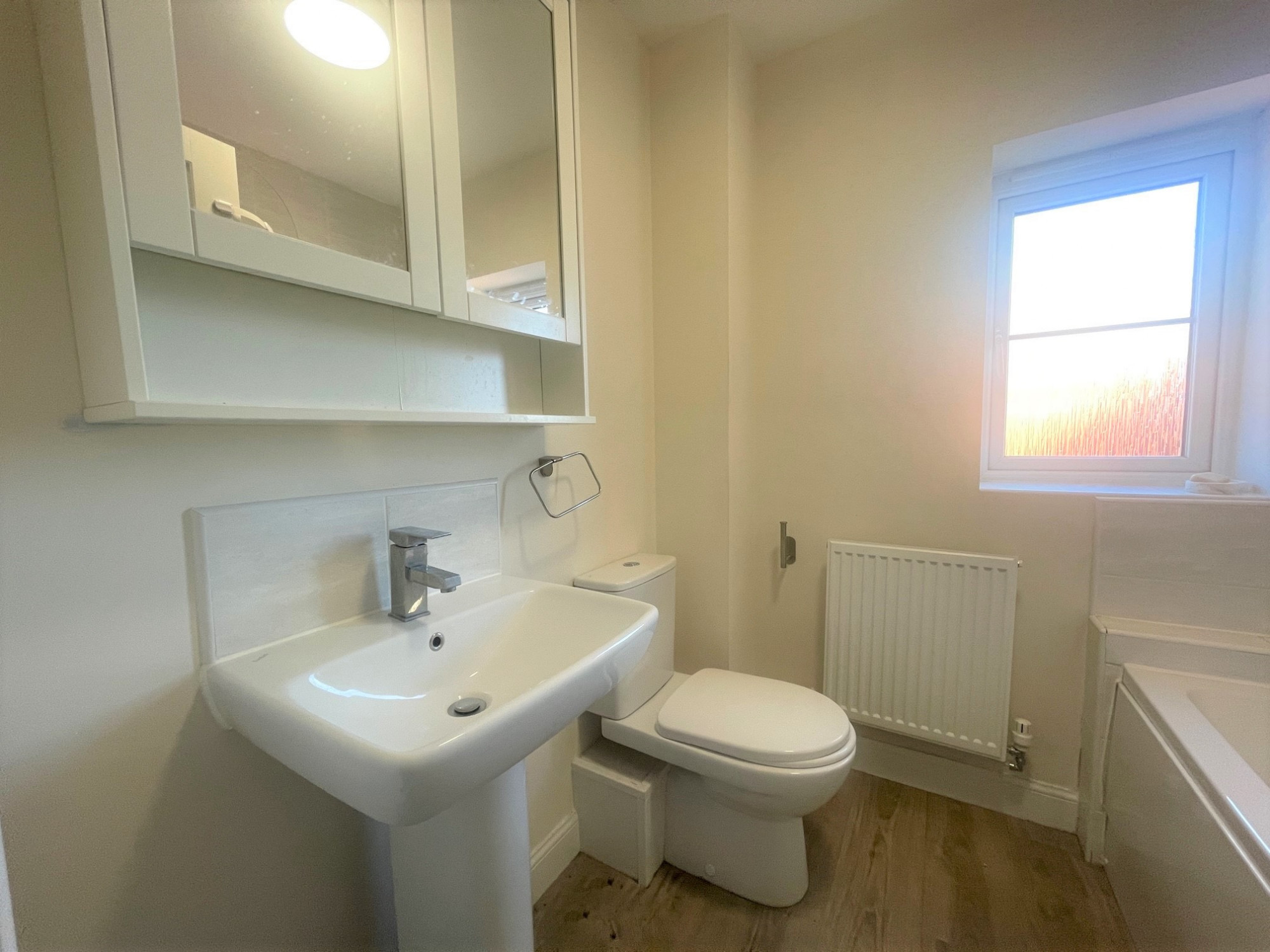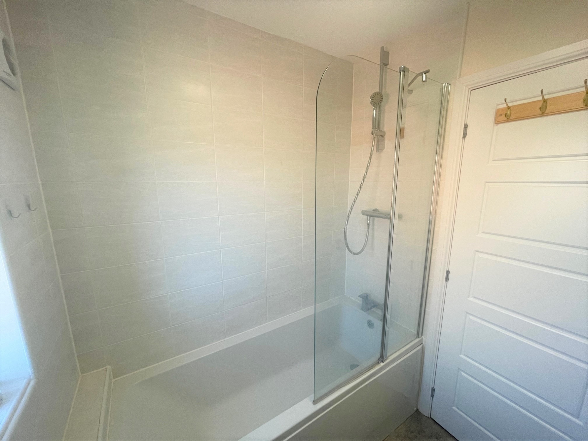 Ceiling light point, part tiled walls, UPVC double glazed window to the side aspect, bathtub with over head shower, low level w/c, wash hand basin and laminate flooring.