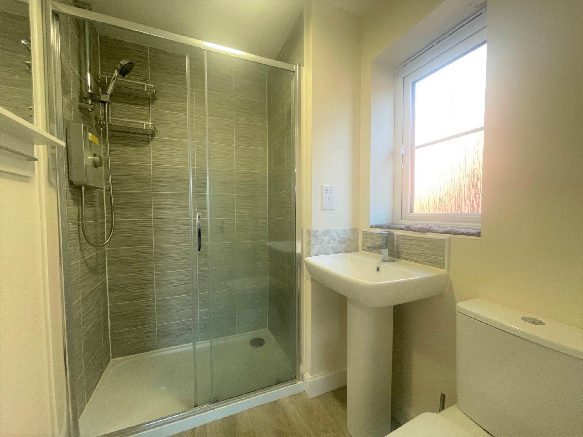 ceiling light point, part tiles walls, UPVC double glazing to the side aspect, large shower tray with overhead shower, low level w.c, wash hand basin and laminate flooring.