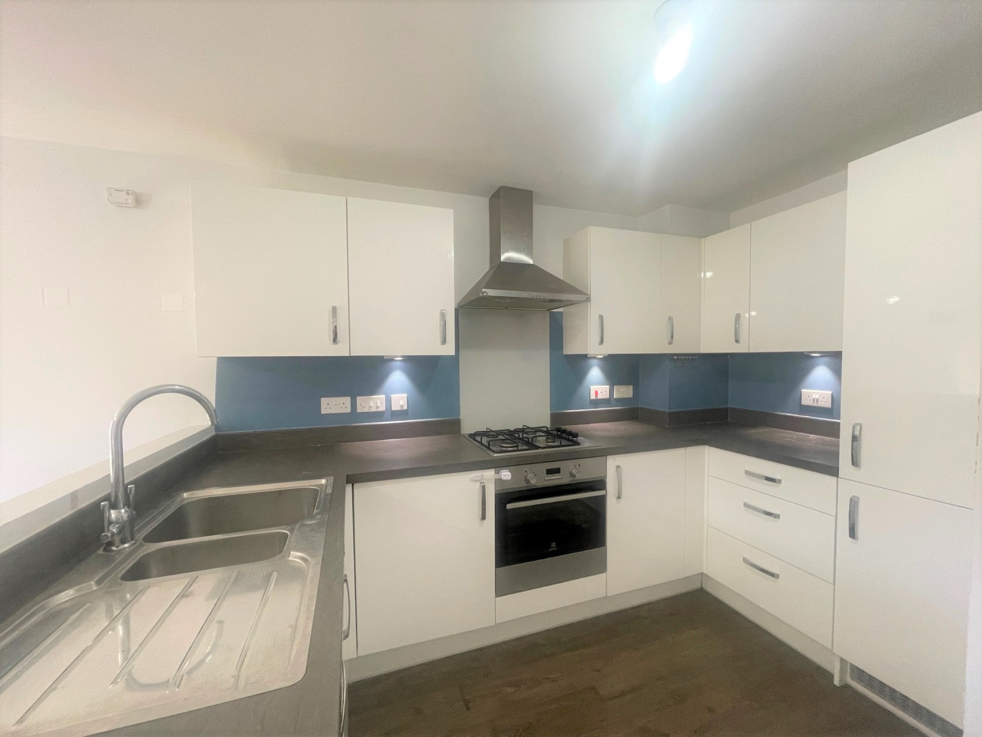 Ceiling light point, extractor fan unit, electric stove with oven, base top units, Steel sink with tap mixer and drainer, storage cupboards and laminate flooring.