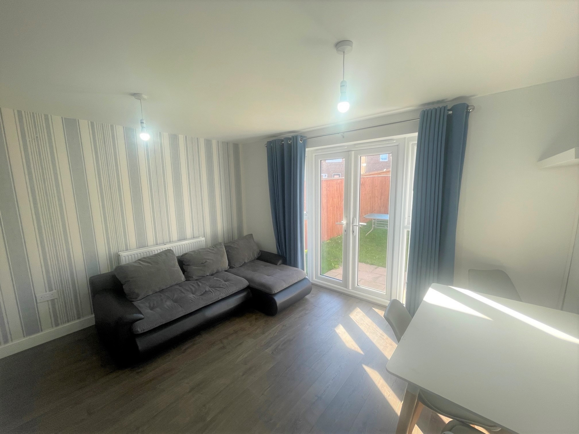 Ceiling light point, painted walls, double glazed windows, French patio doors for access to the rear, laminate flooring.