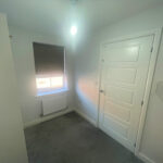 Entrance door, ceiling light point, white painted walls, laminate flooring.