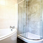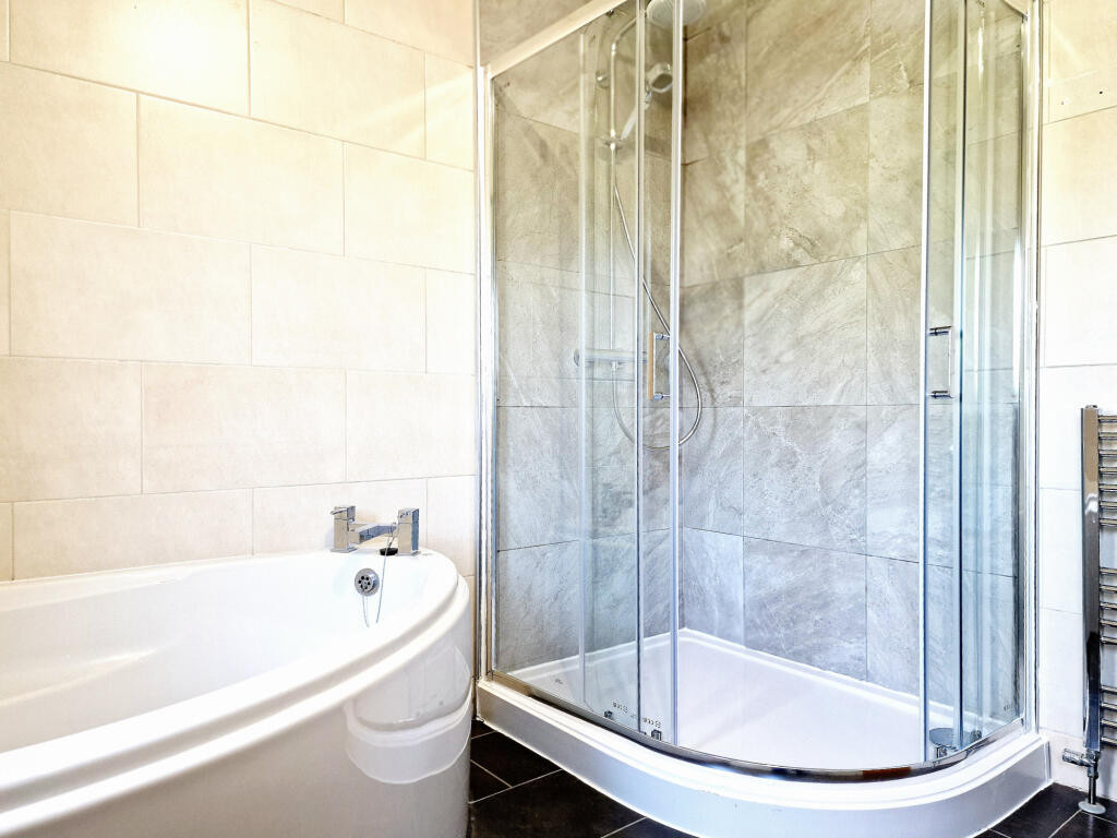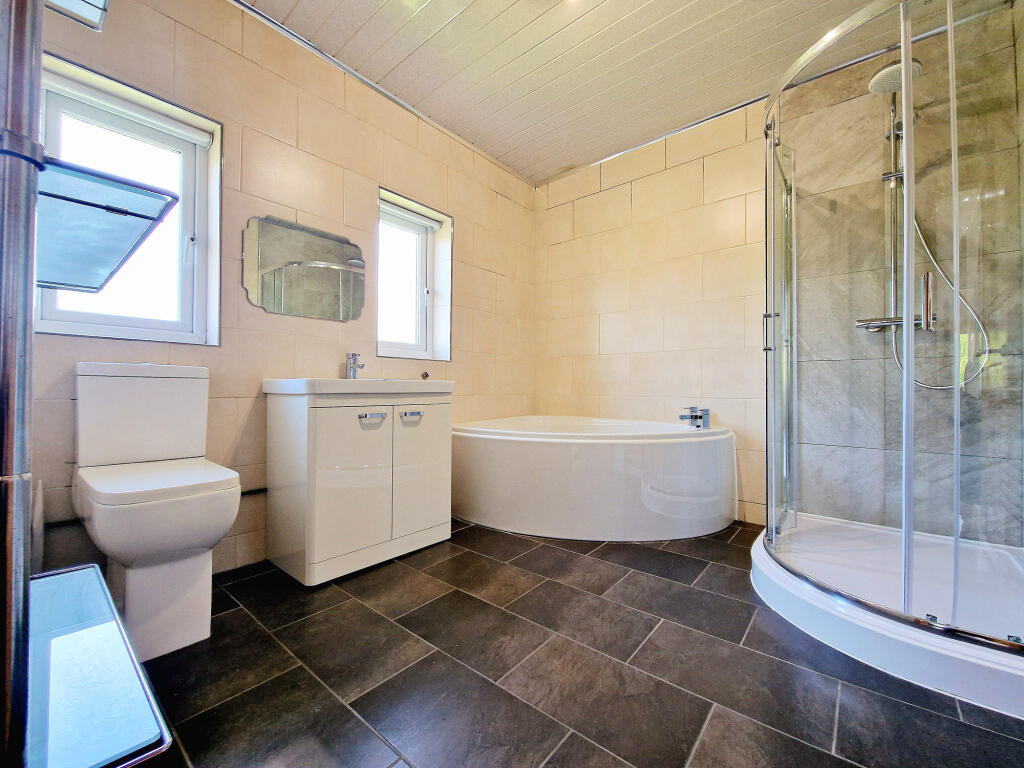 The modern family bathroom is a sanctuary in itself, fitted with premium fixtures including a bathtub, separate shower enclosure, contemporary basin, and WC all finished with elegant tiling and chrome accents for a refined touch.