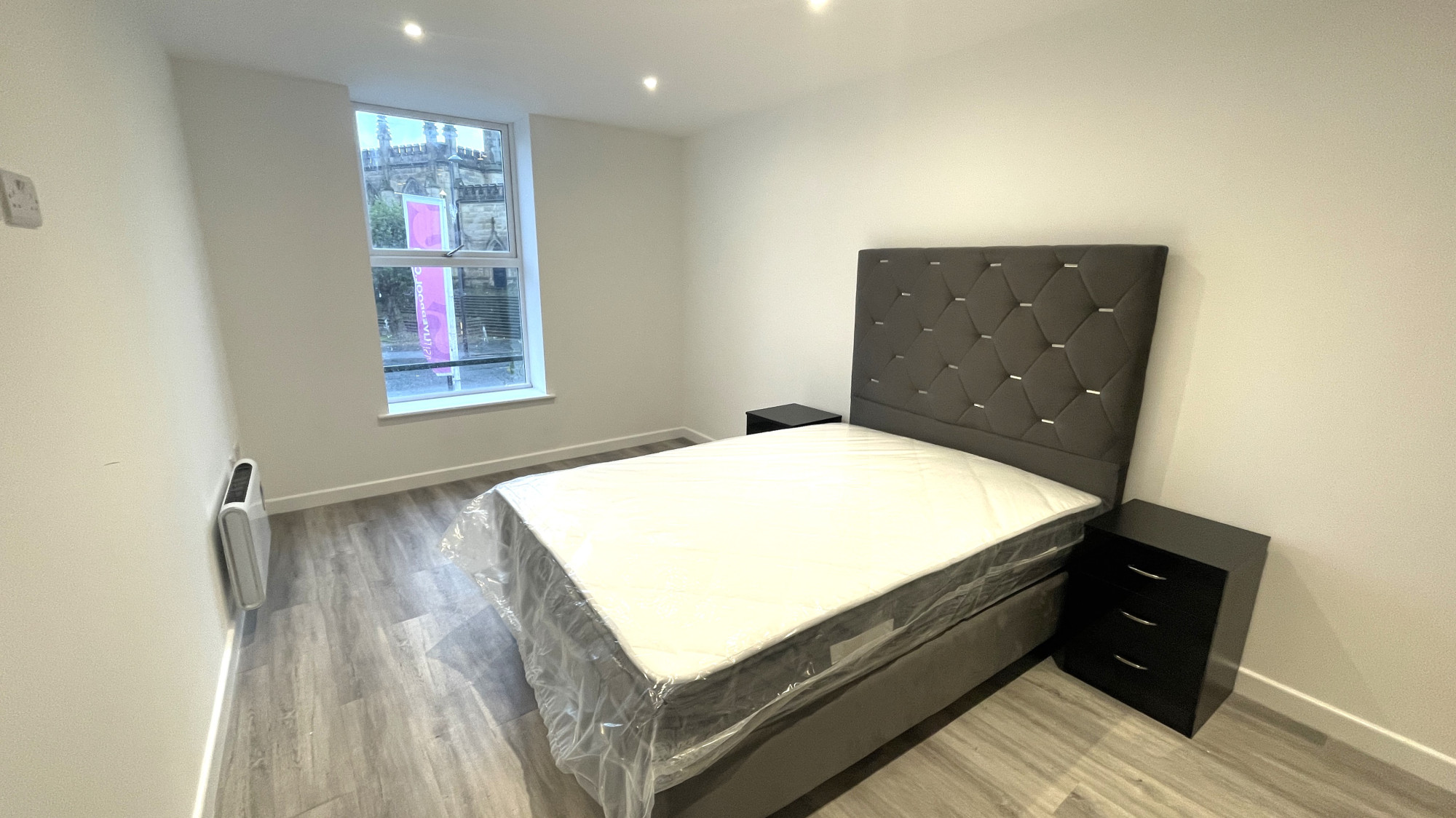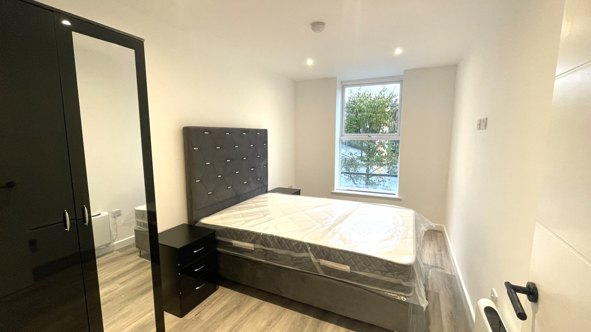 - Furnished with a double bed, wardrobe and bedside units.