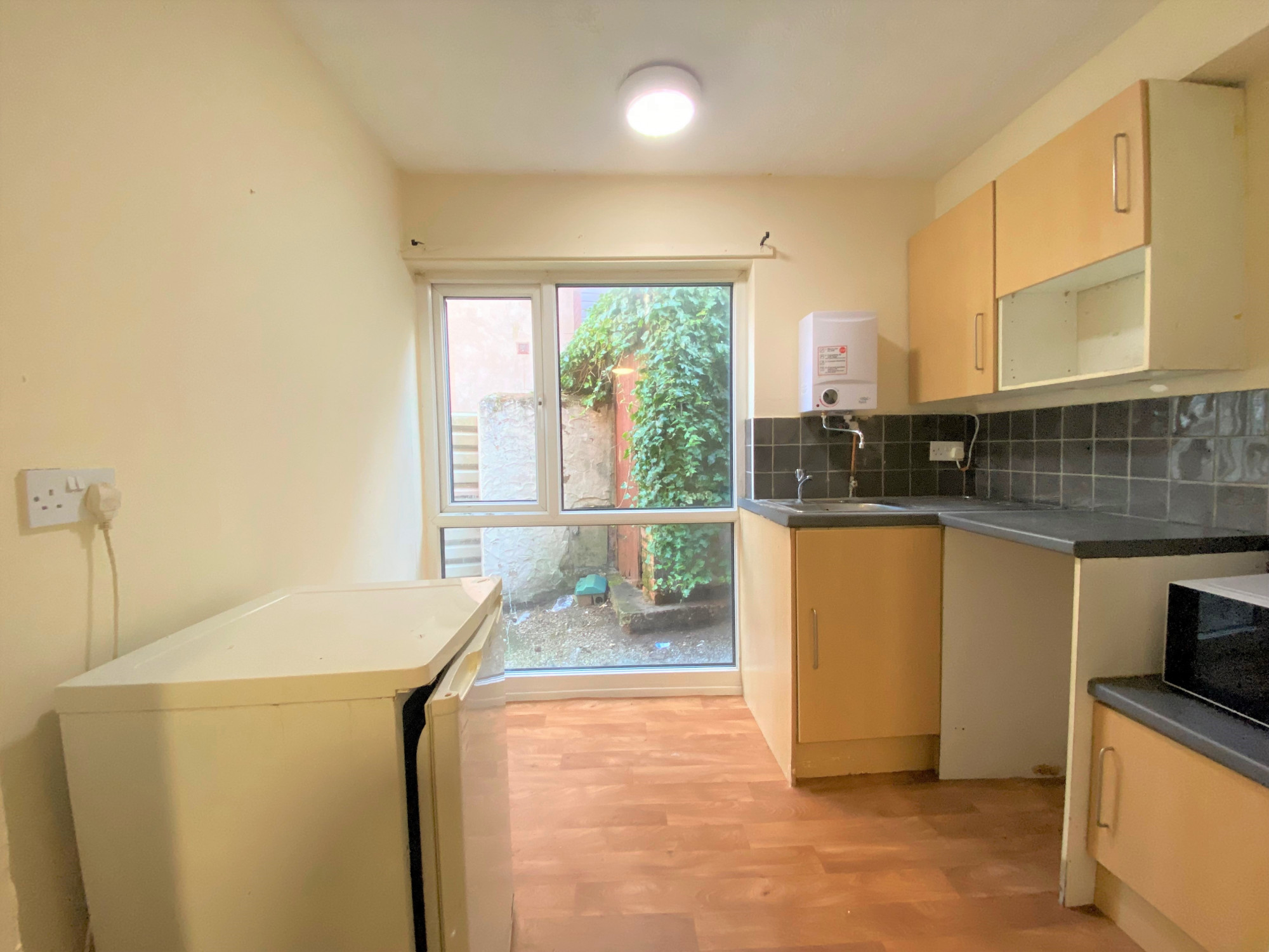 Kitchen: Wall and base units with Fridge, sink and standalone cooker.