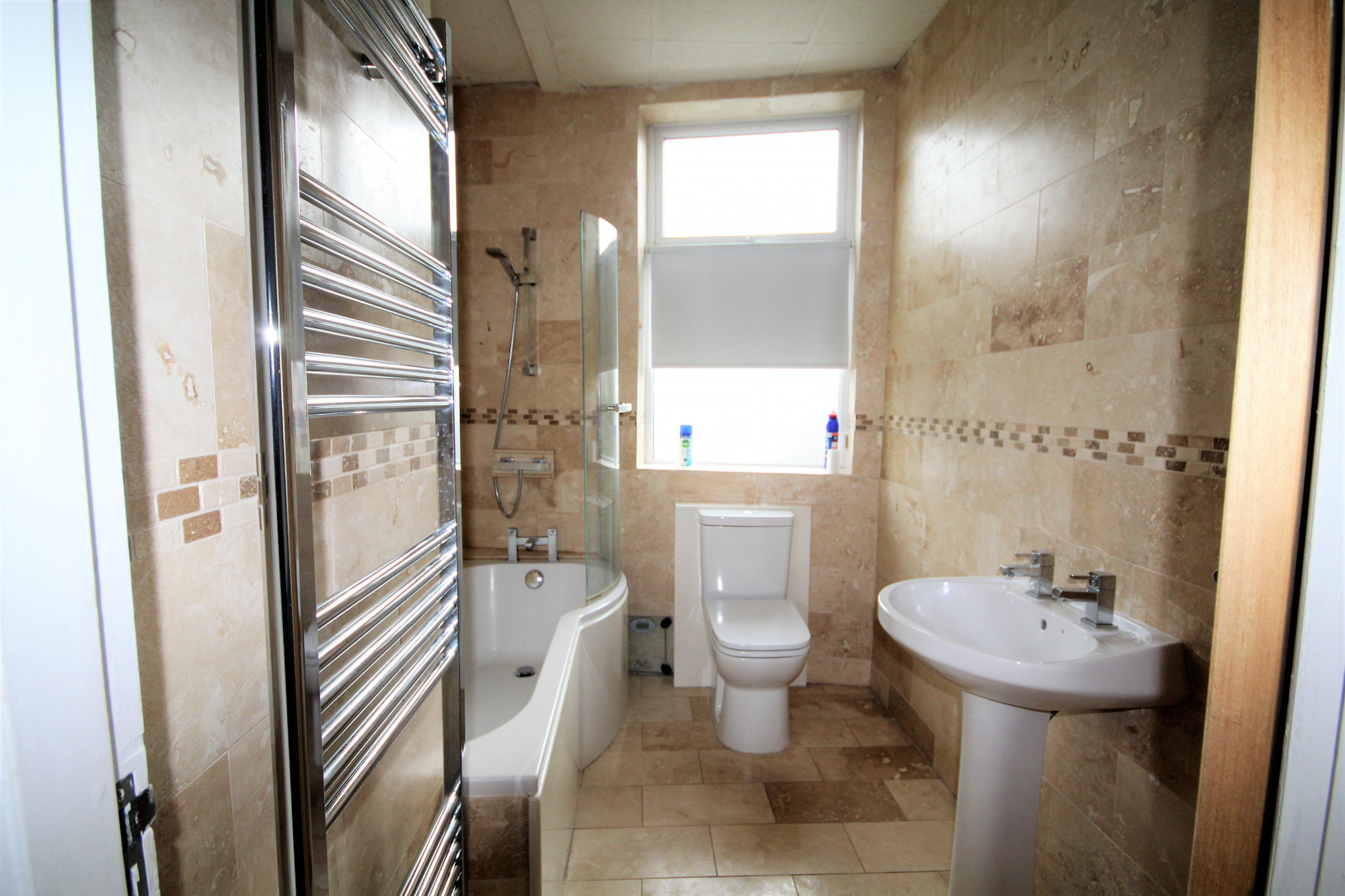 BATHROOM with bath and mixer tap shower, W/C, hand basin, fully tiled.