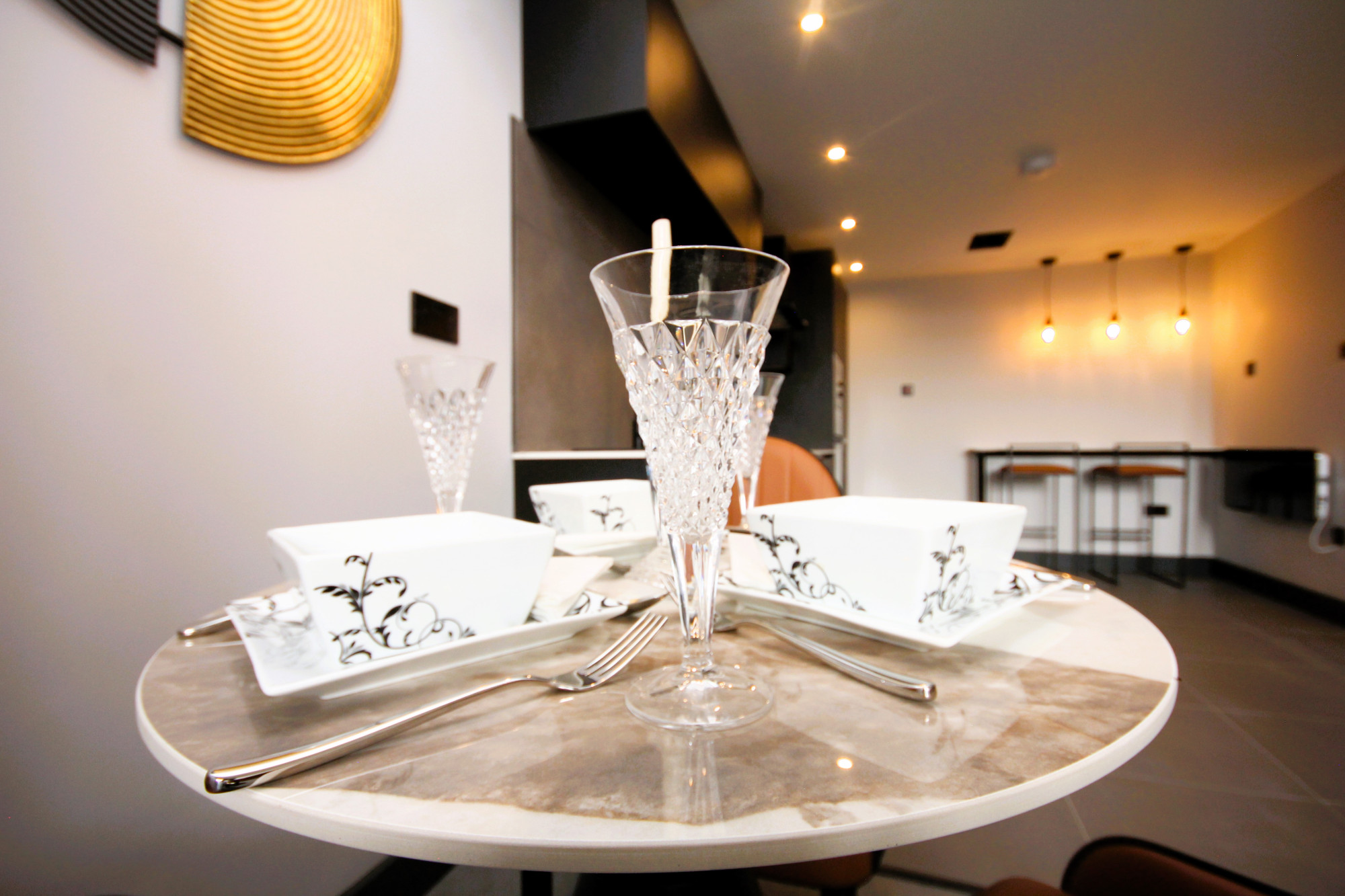 SPC flooring, various power points and sockets, luxury sofas and marble coffee table, fully integrated kitchen with fridge/ freezer, washing machine, electric hob and oven, tiled splash back. Marble breakfast bar with chairs and dining table with dining chairs, also plenty of natural lighting through the big windows.