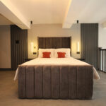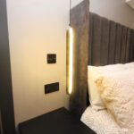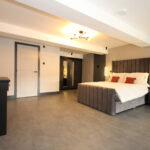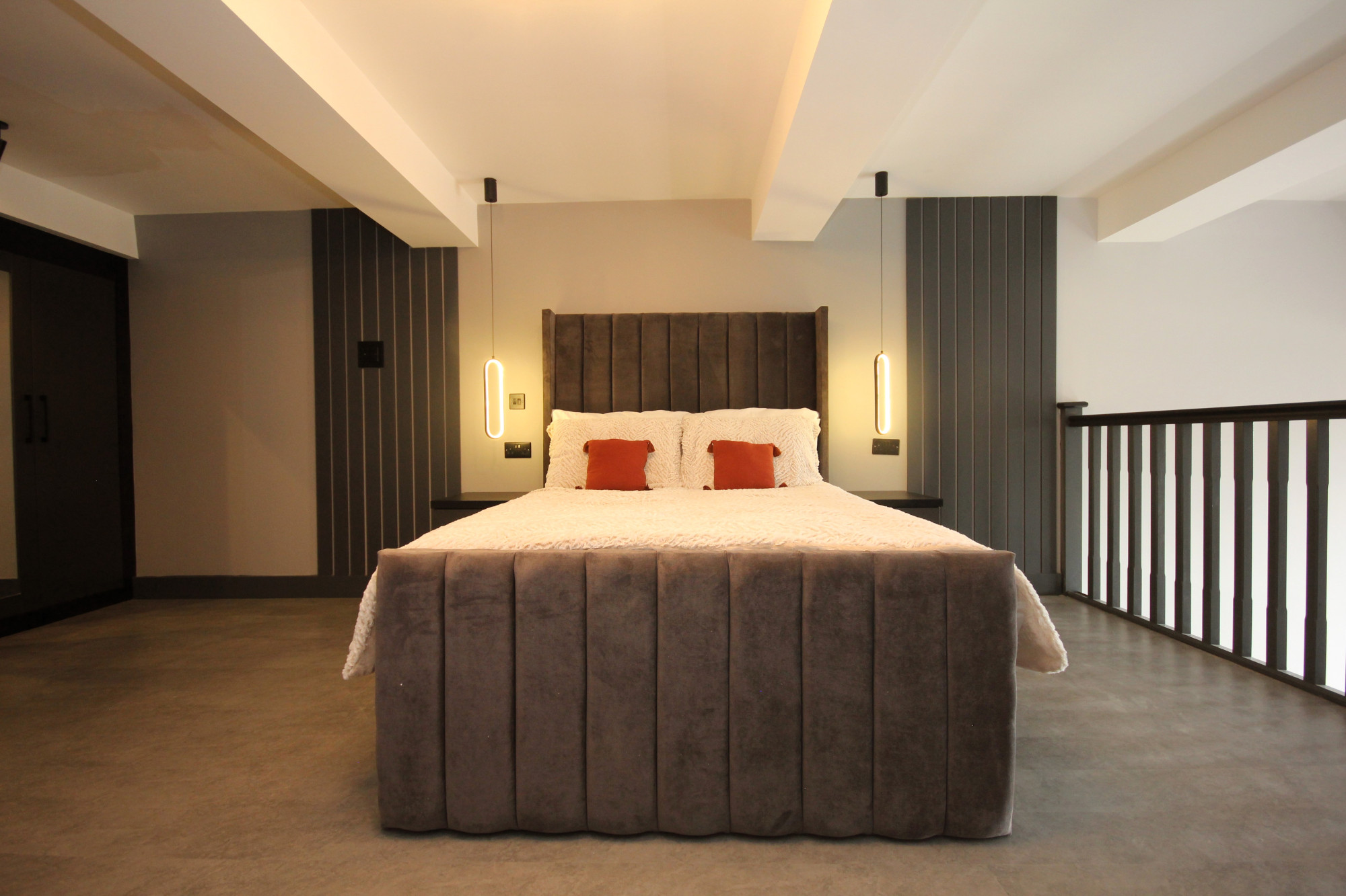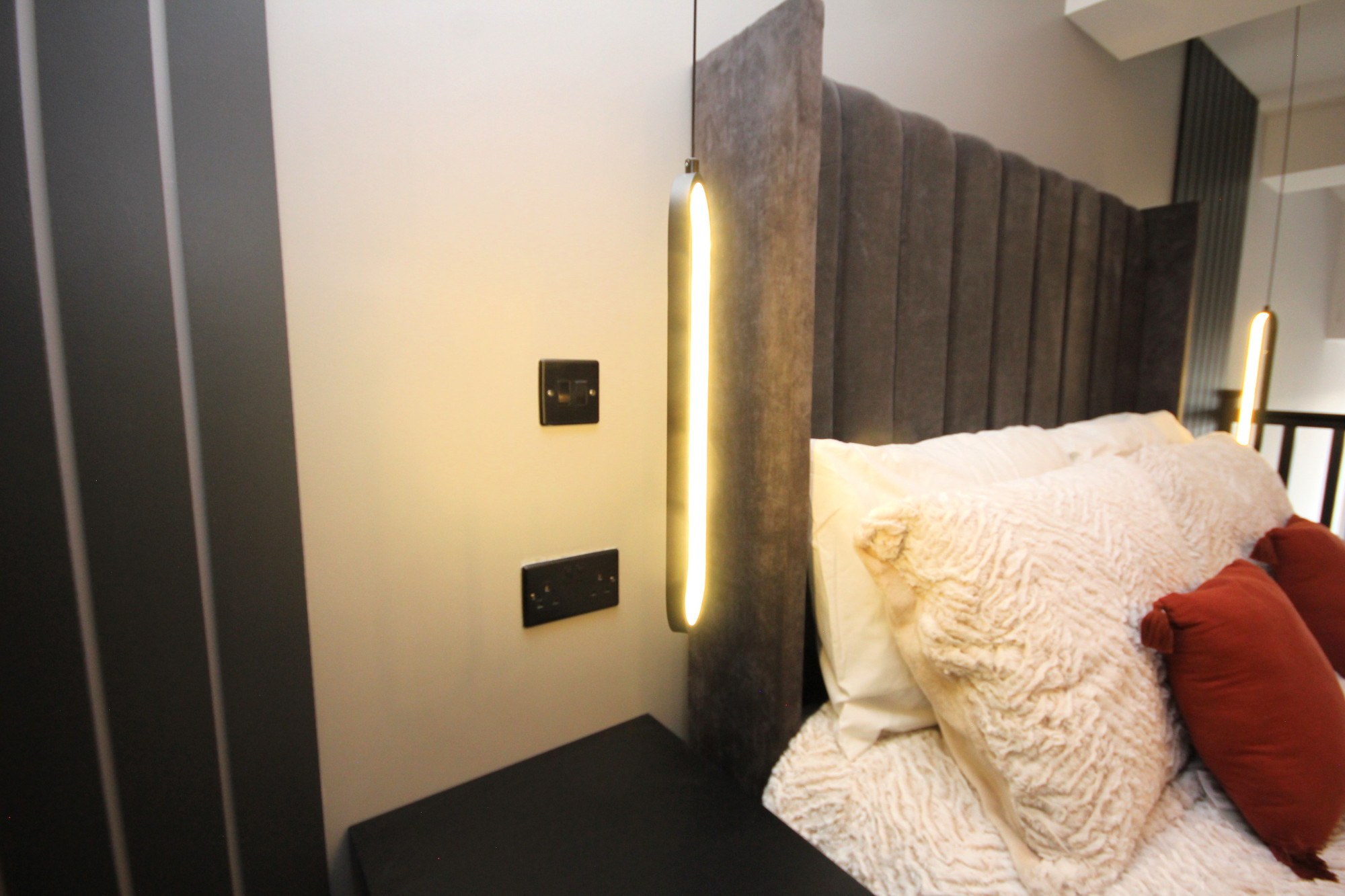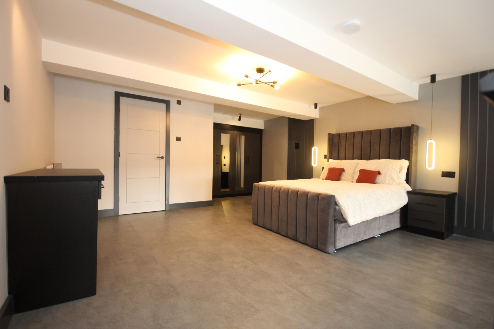 Large bedroom, double bed, SPC flooring, electrical heating, fitted wardrobe with lighting, bedside cabinets, suspended bed side lights, various power sockets, black chrome finished switches and study desk.