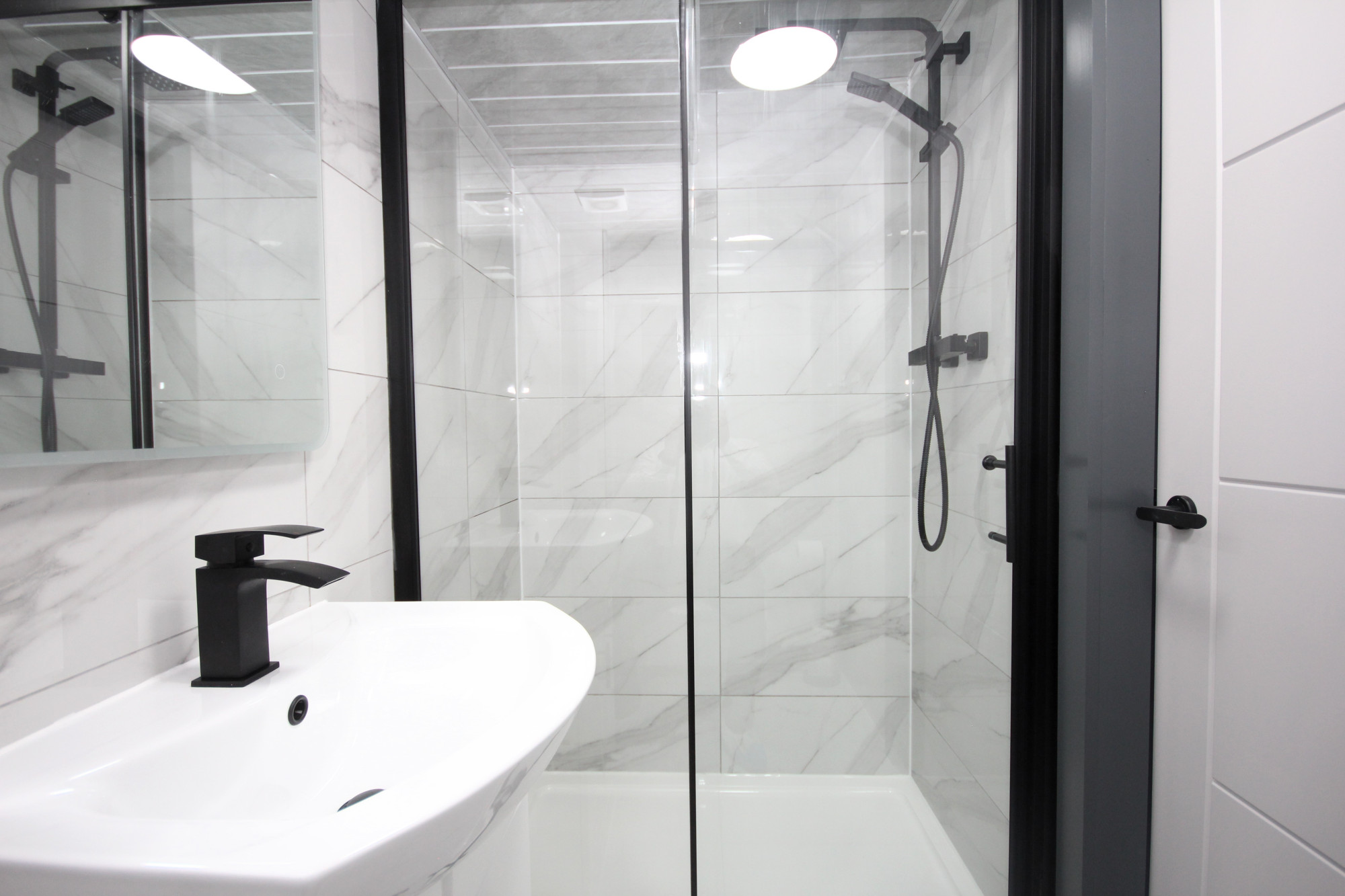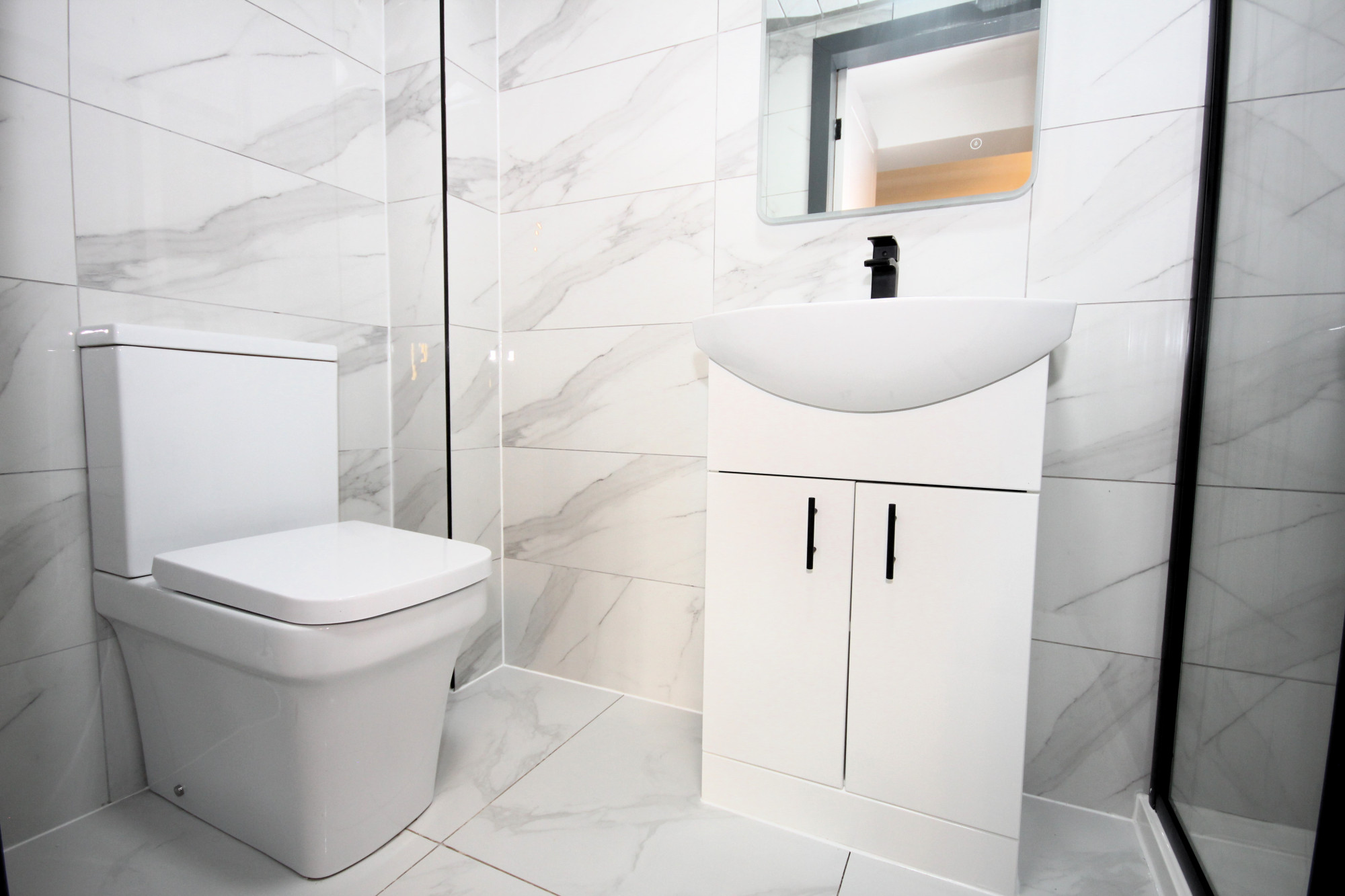 Designer bathroom with W/C, black sanitary ware, large led mirror, walk in shower with shower screen and tiles fully throughout.