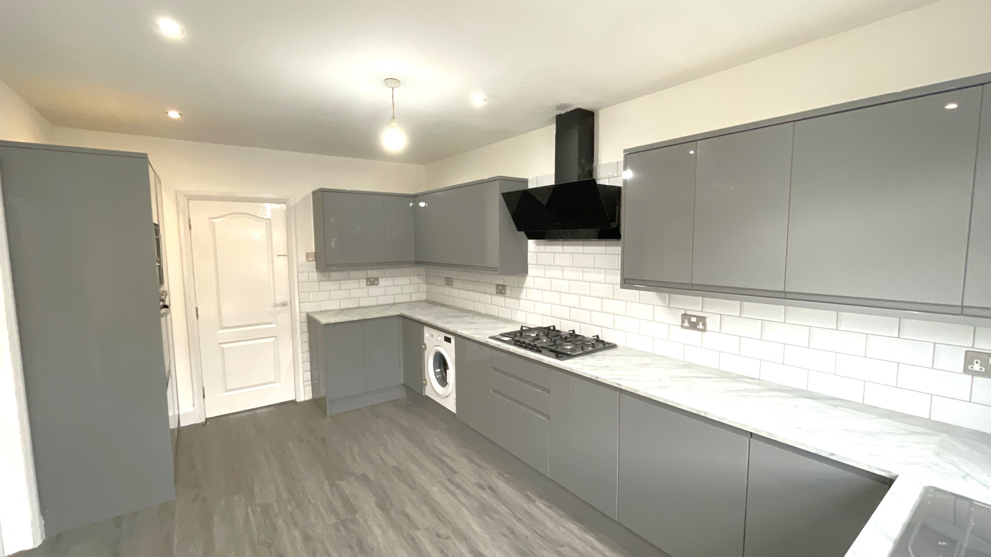 The kitchen is home to laminate flooring, base and wall mounted units with contrasting counter tops, an integrated fridge/freezer, integrated cooker, integrated microwave, integrated washing machine, integrated dishwasher, a gas hob with overhead extractor, sink with drainer, spotlights and central ceiling light point, double glazed window and access to the rear yard.