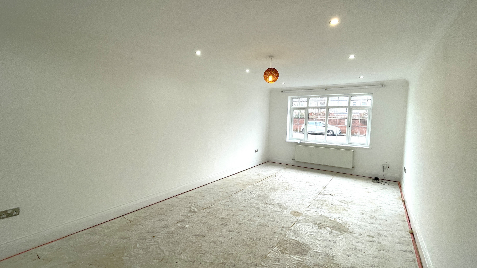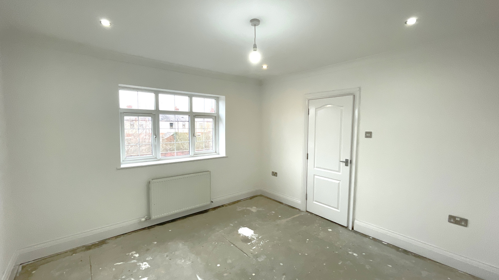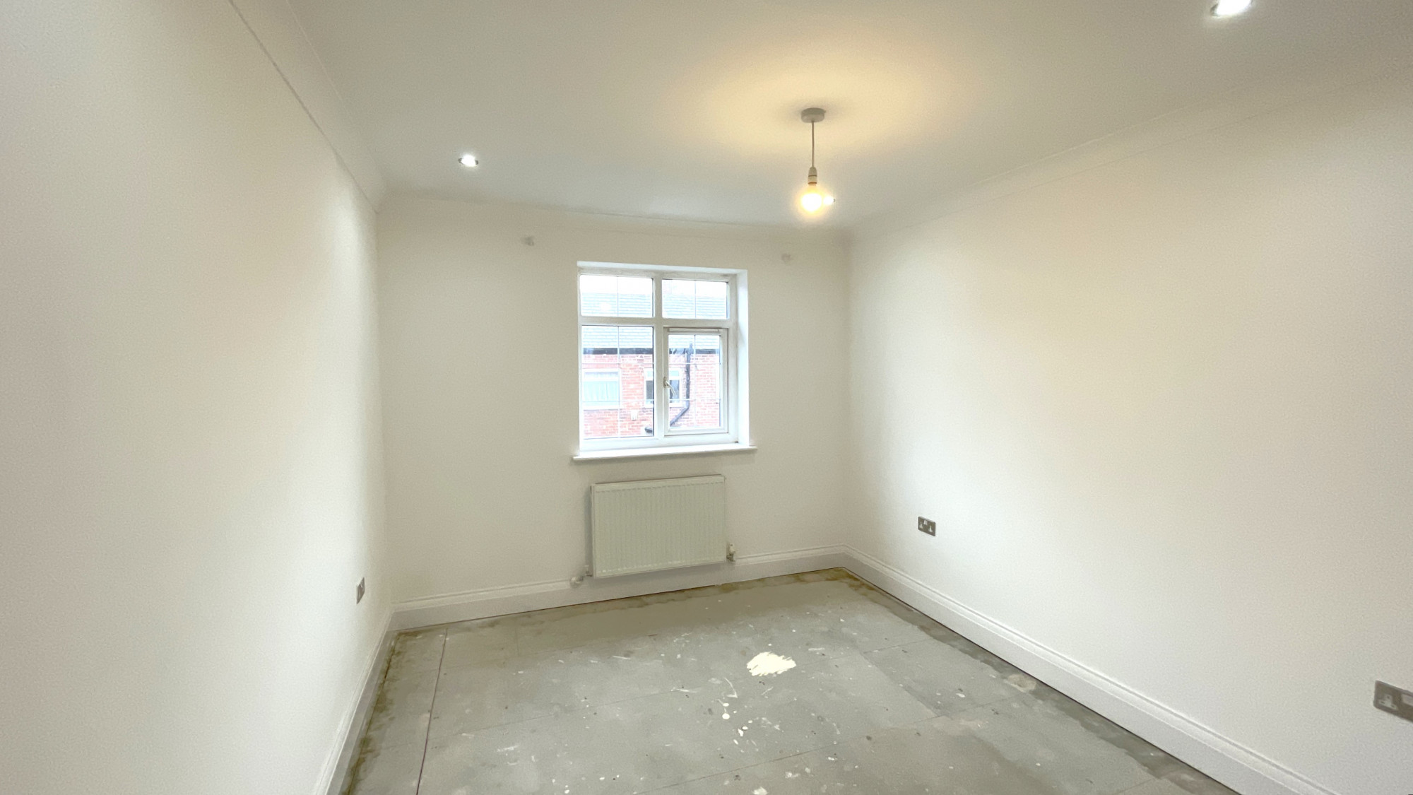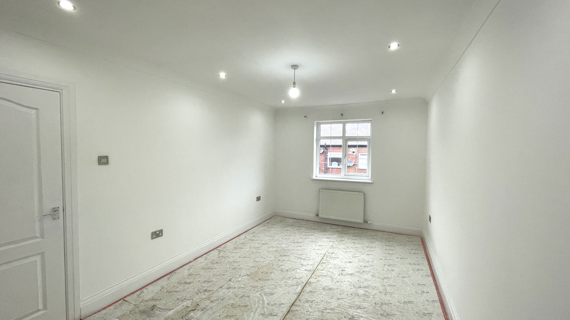 The first bedroom contains skirting boards, painted walls, wall mounted radiator, spotlights and central ceiling light point and double glazed windows.