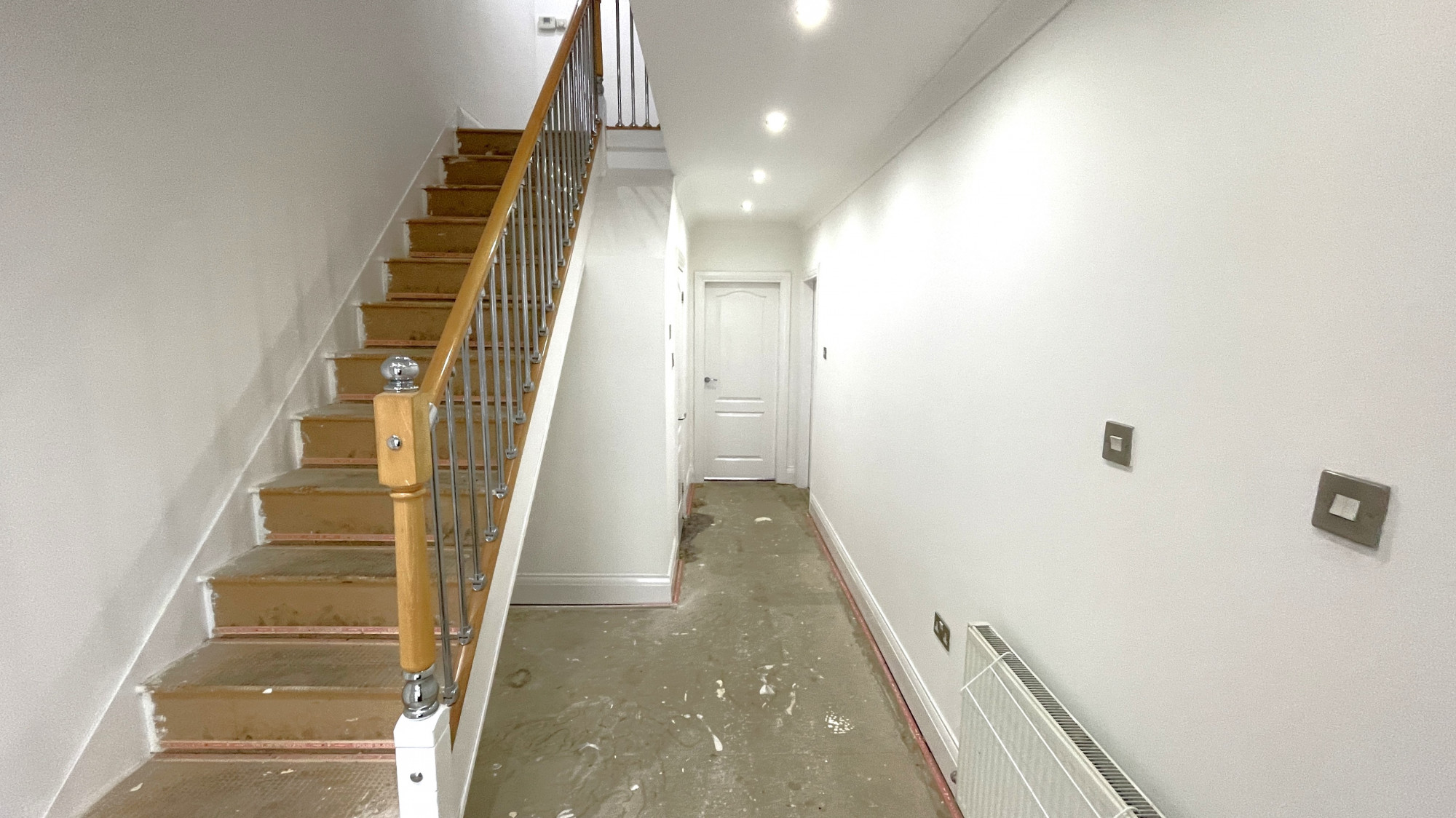 The entrance hallway contains skirting boards, painted walls, wall mounted radiator, coving, spotlights and access to 2 reception rooms, downstairs toilet and the kitchen.