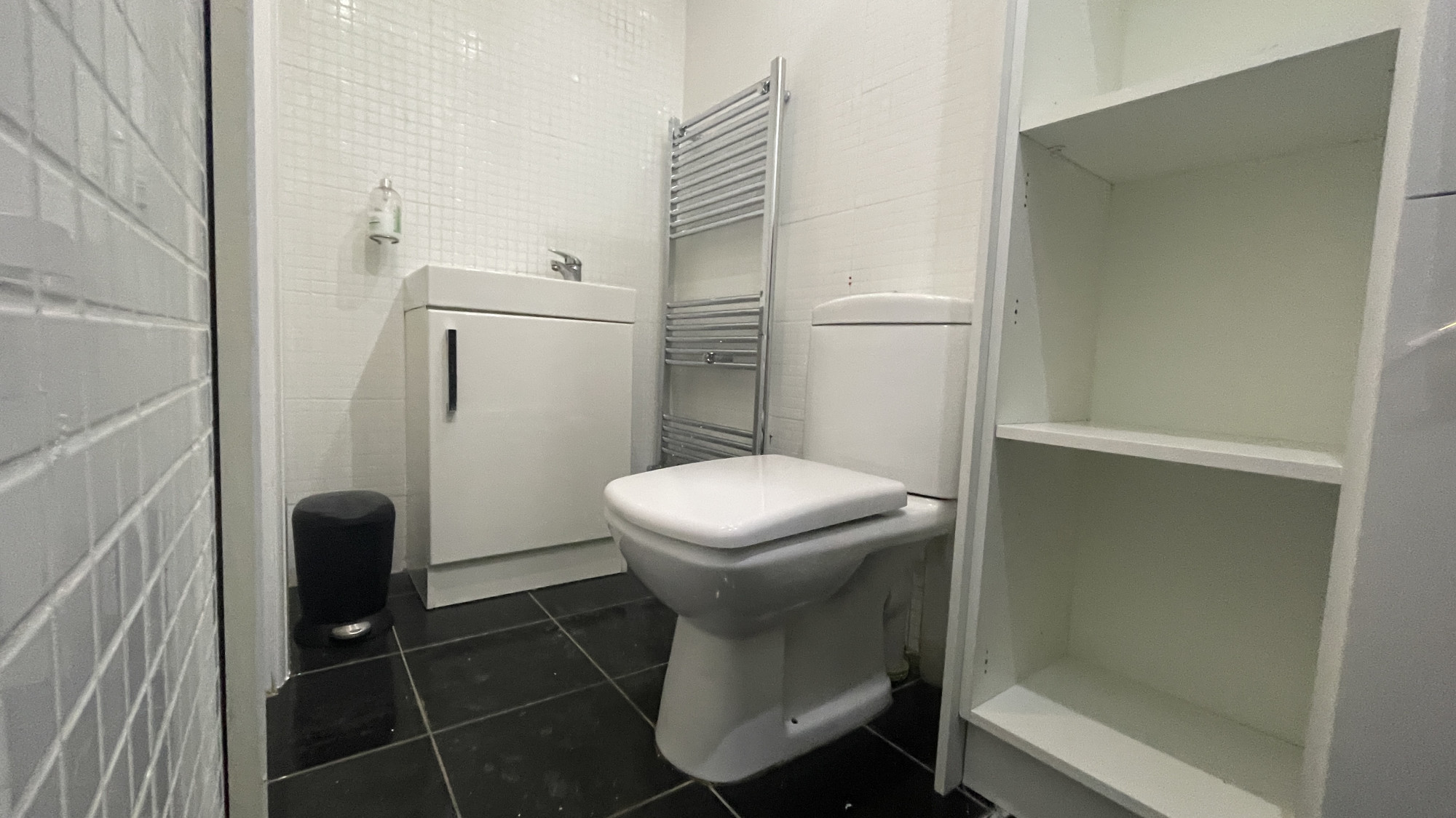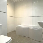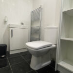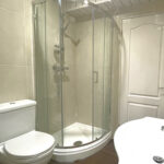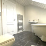 The downstairs bathroom is comprised of tile floor, tile walls, low level W/C, wash hand basin, heated towel rail, storage units, panel ceiling with spotlights and extractor fan.