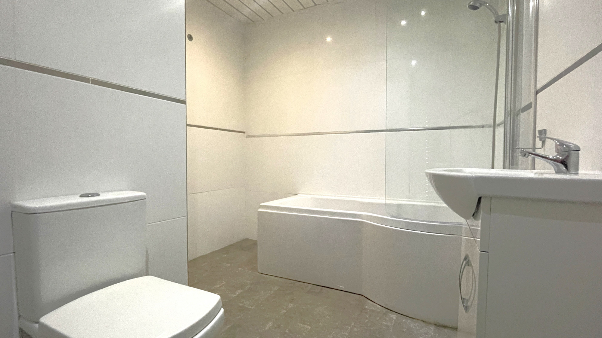 The family bathroom is home to a tiled floor, tiled walls, low level wc, wash hand basin, bath with overhead shower and a panel ceiling with spotlights throughout.