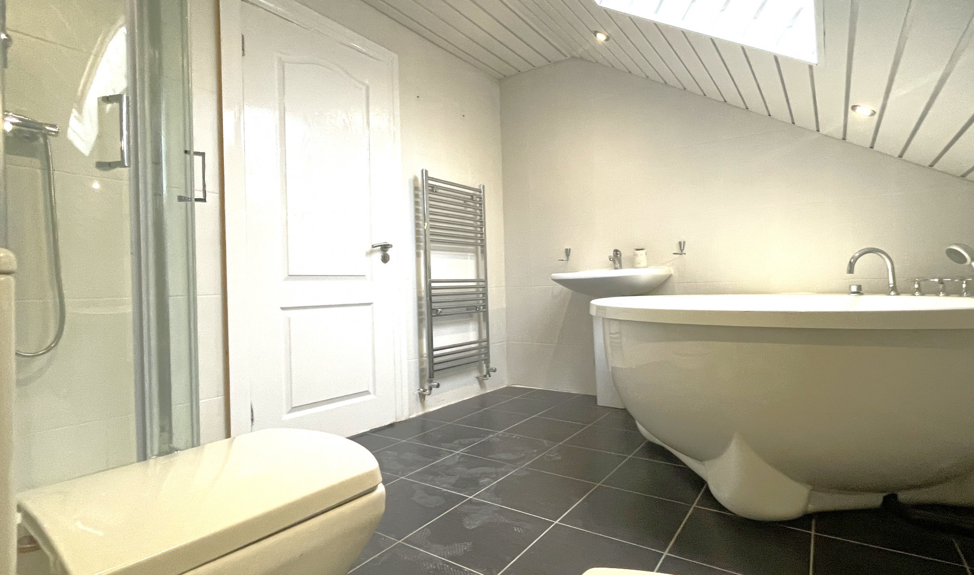 The en suite houses a tiled floor, tiled walls, low level W/C, a bidet, wash hand basin, heated towel rail, shower, jacuzzi bath, panel ceiling with spotlights and a double glazed skylight.