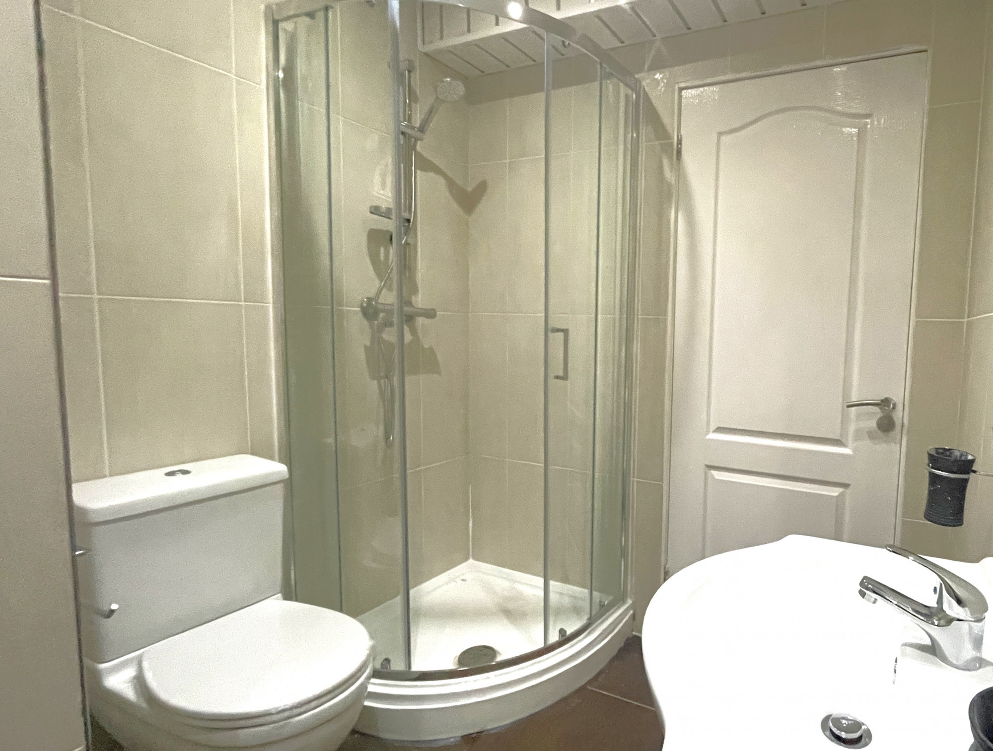The shared en suite contains tiled floor, tiled walls, heated towel rail, low level W/C, wash hand basin, shower, heated towel rail, panel ceiling and has spotlights throughout.