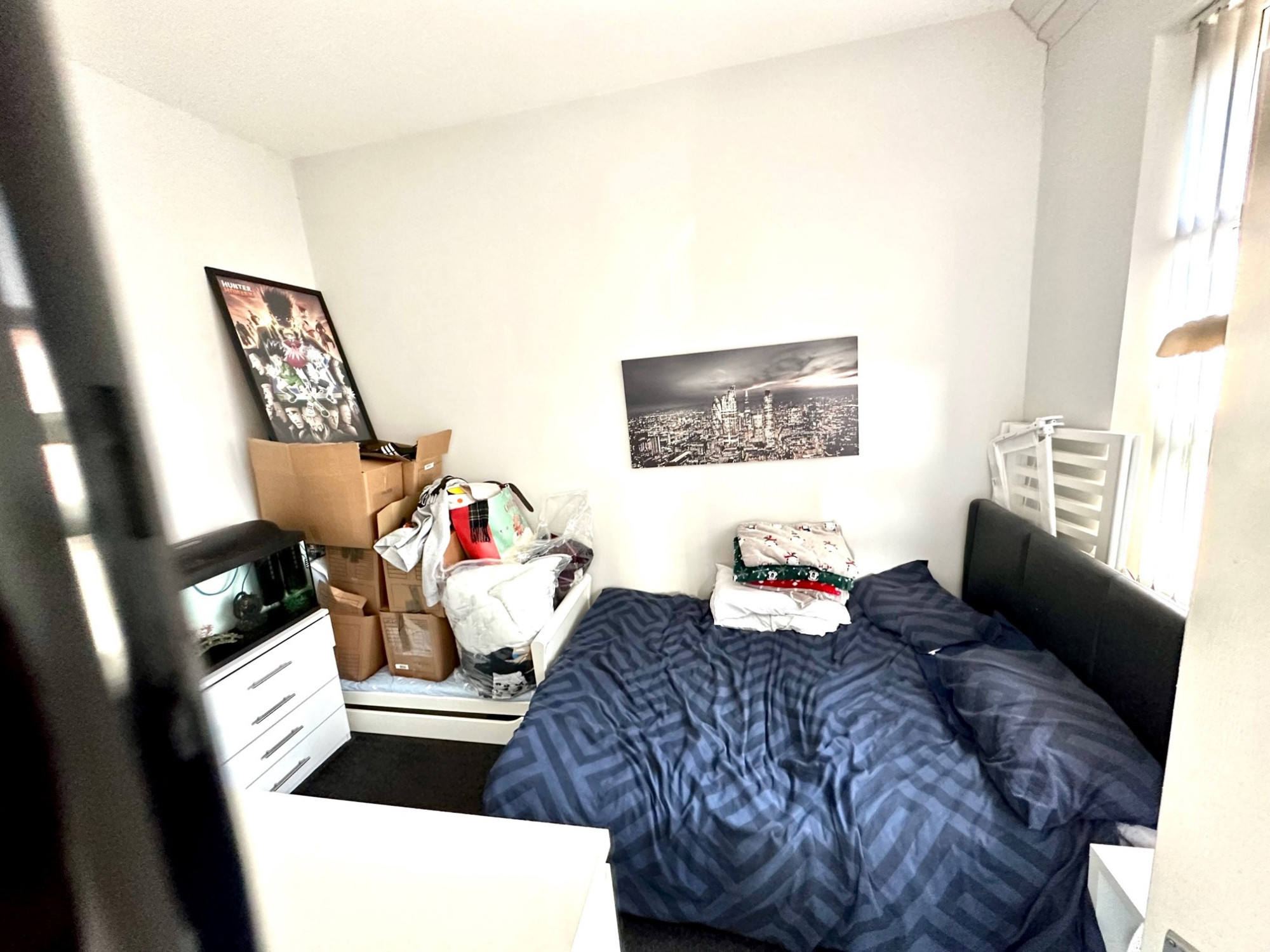 Bedroom with heating, double glazed window, painted walls, carpets.