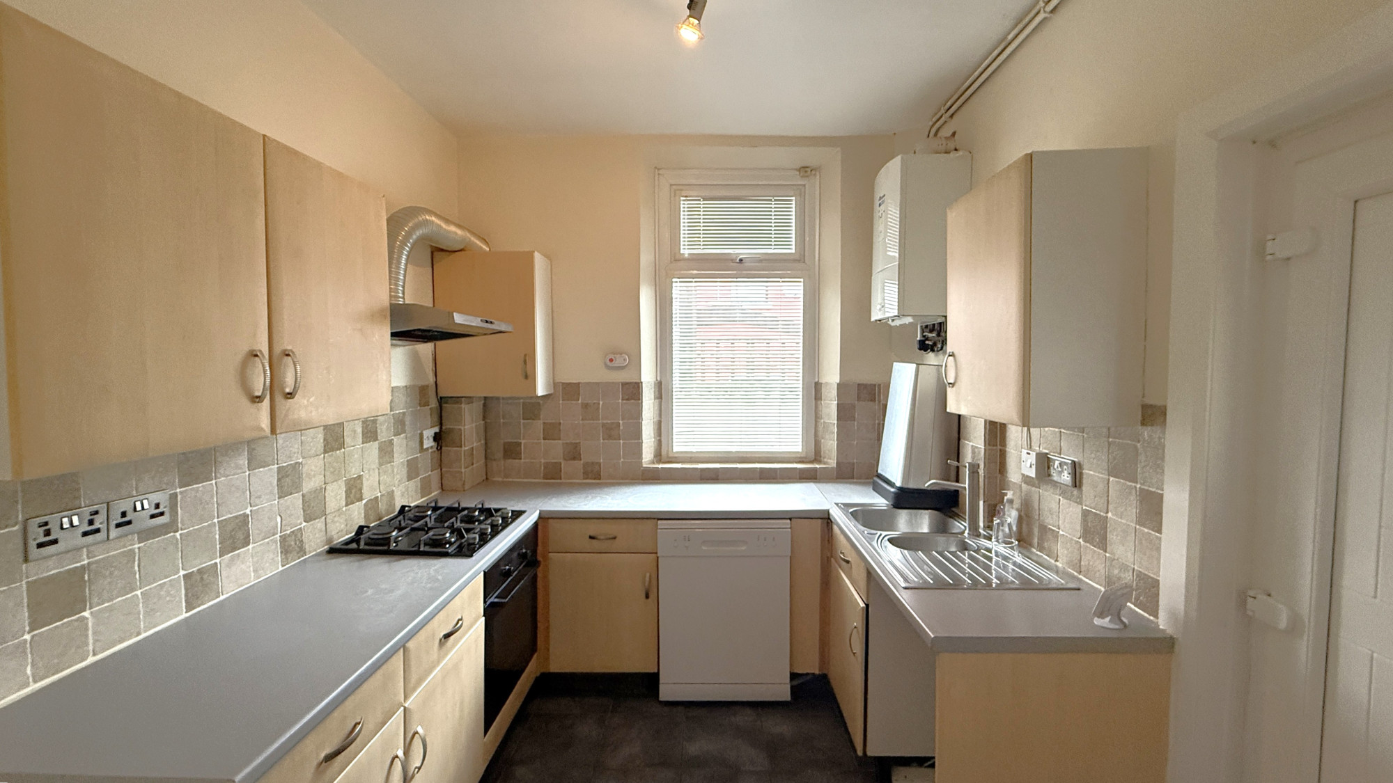 The property boasts a clean kitchen with built in oven and hob included, a dishwasher, tiled flooring, painted walls and double glazed windows with access to the rear yard.