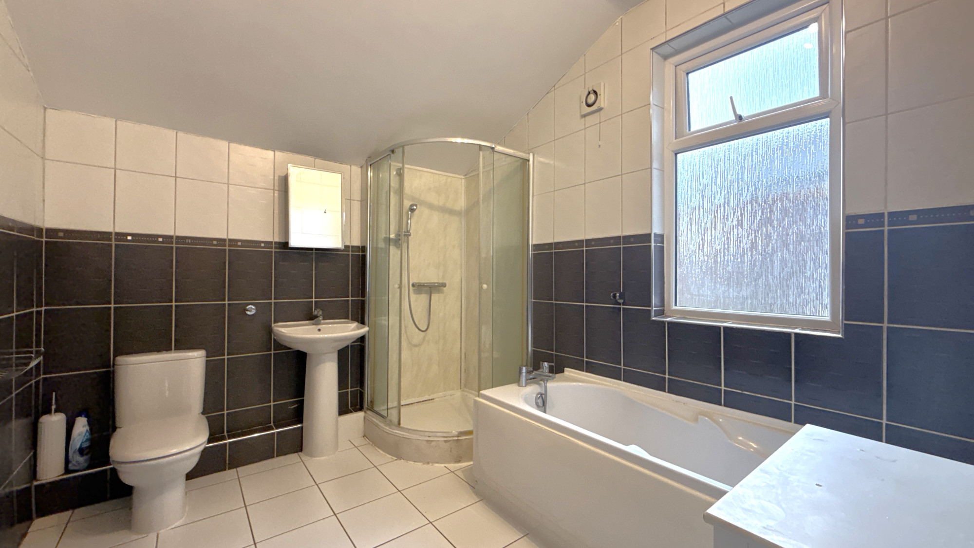 The bathroom consists of a bath tub, large shower, fully tiled walls, W/C, and wash hand basin.