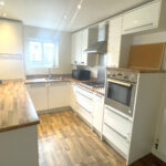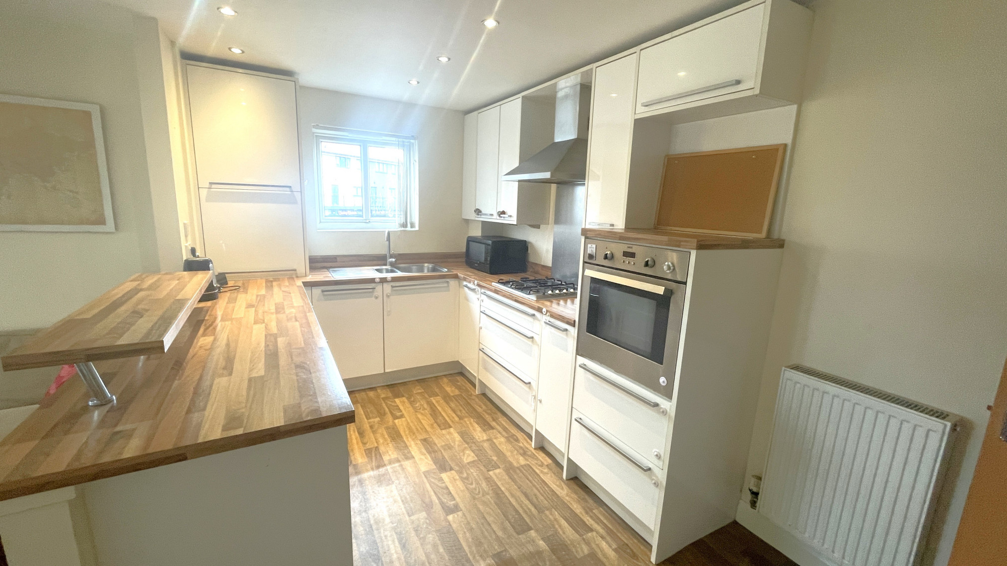 Vinyl flooring, Base and wall mounted units with contrasting counter tops, Spotlights, Integrated appliances, fitted gas hob, Extractor fan, microwave, Fitted Fridge Freezer, Washing Machine, Gas Boiler, Stainless steel sink with swan tap, Wall mounted radiator