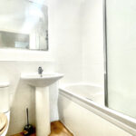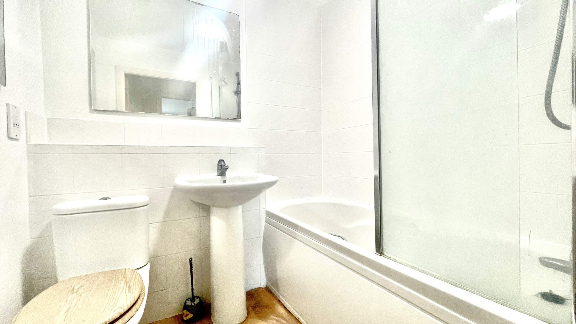 Vinyl flooring, Painted wall, tiling around the bath & sink area, overhead shower, Wash hand basin, low-level WC, Extractor fan, central ceiling light, Shaver point, wall mounted mirror
