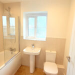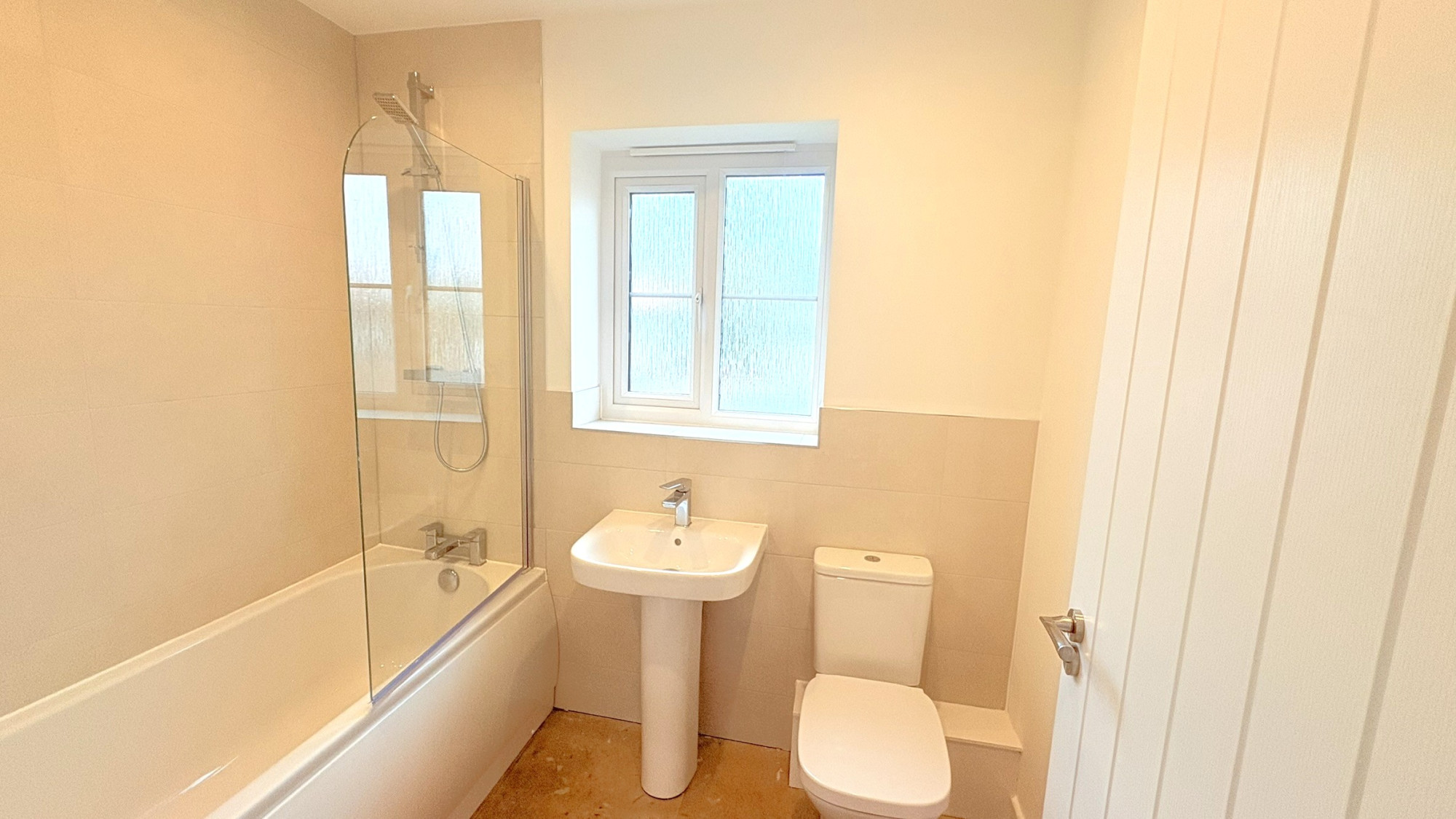 The family bathroom has a bathtub with over head mains shower, sink with pedestal, low level W/C, double glazed window, towel radiator, spot lighting.