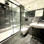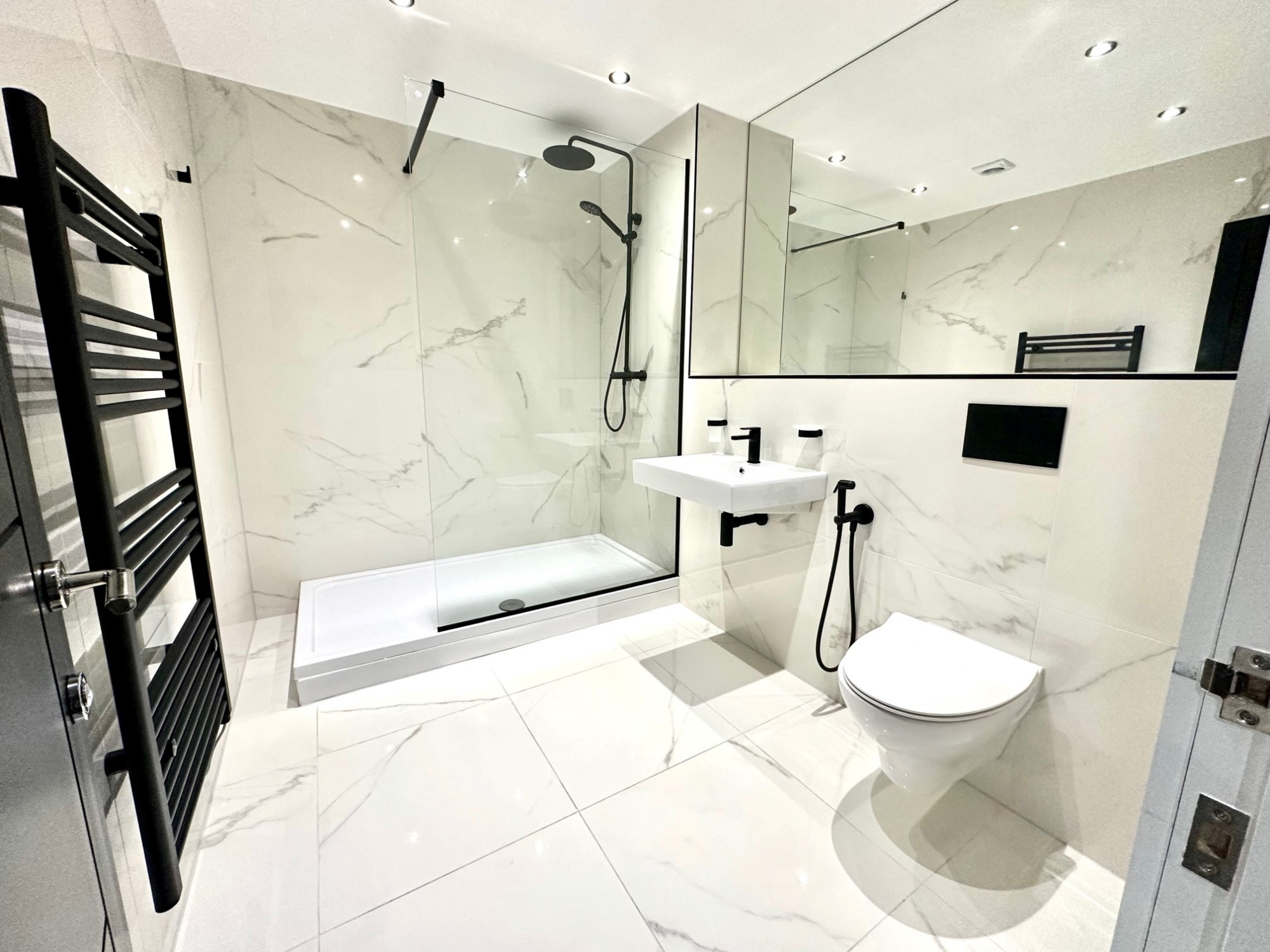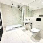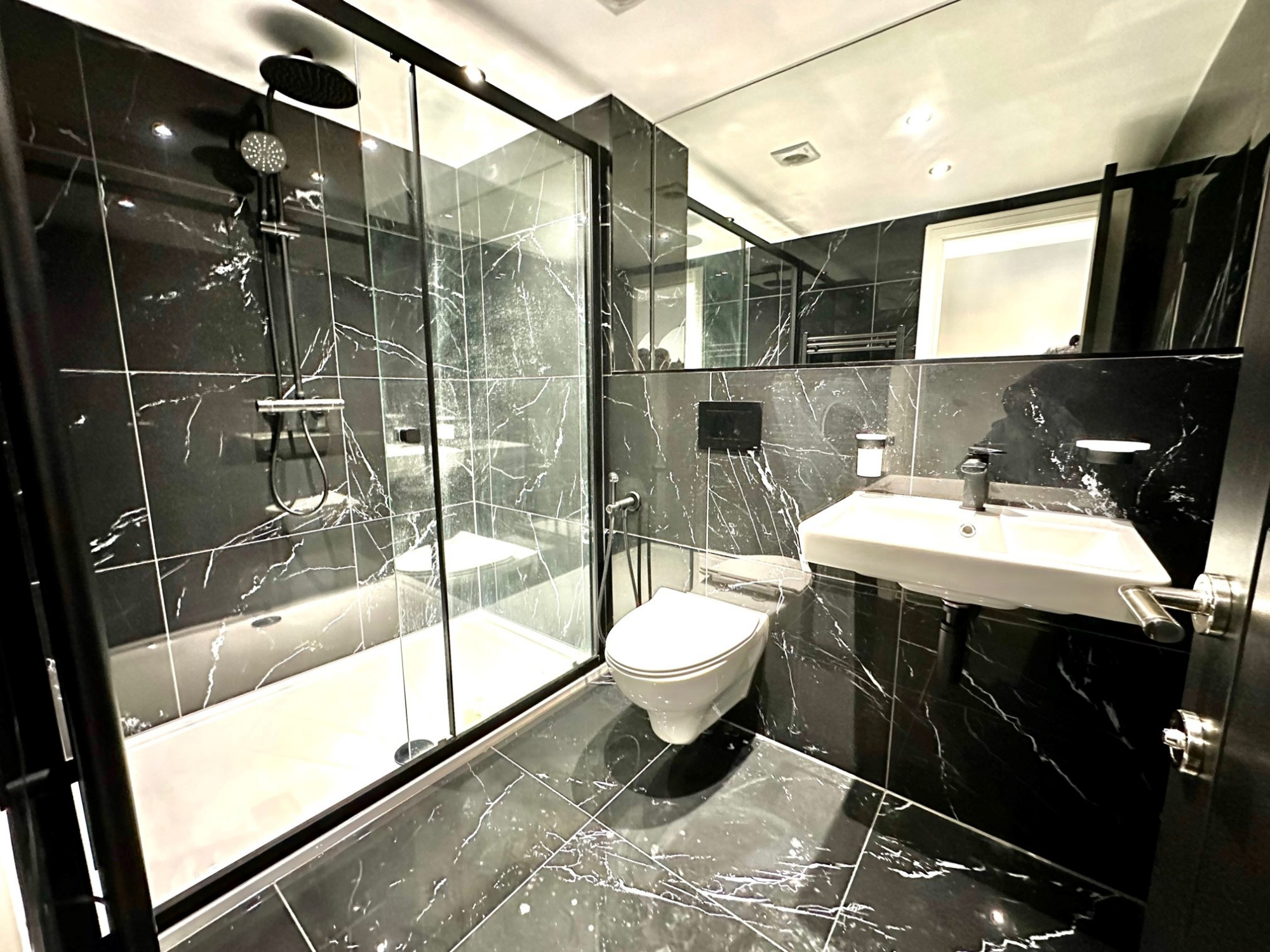 Designer bathroom with W/C, black sanitary ware, wall hung toilet and sink, large set back mirror, walk in shower with shower screen and fully Spanish marble tiled effect bathrooms