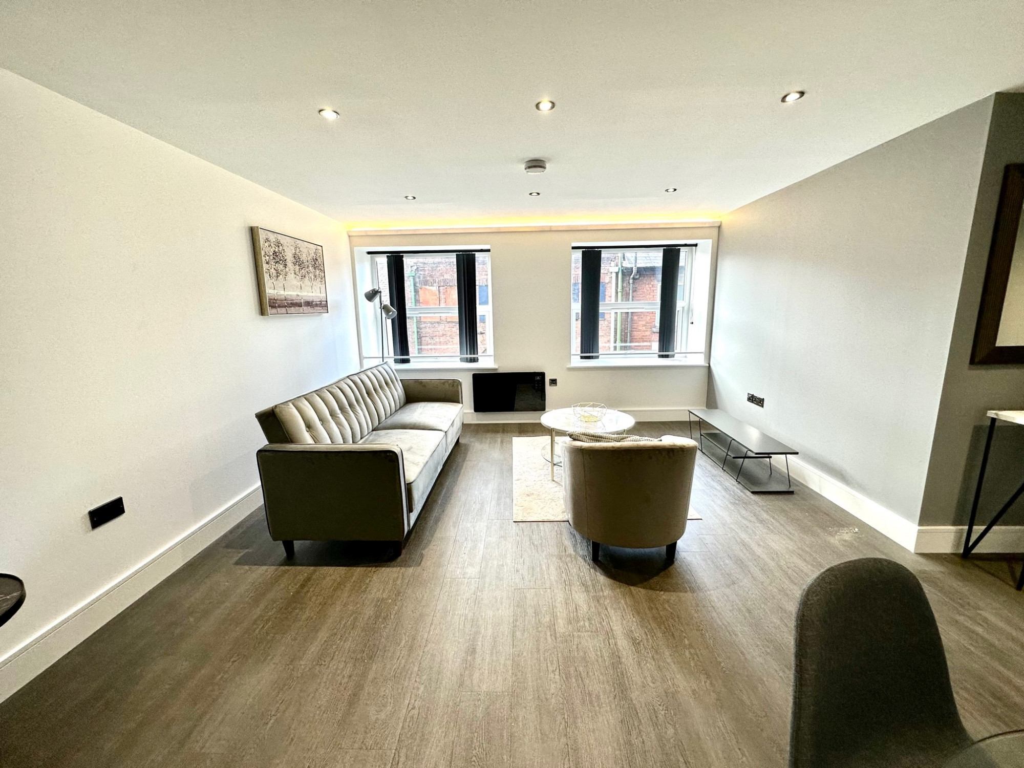 Colour touch screen video door entry system. Herringbone LVT flooring, modern LED lighting and access to all rooms.