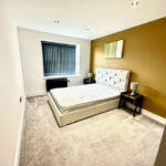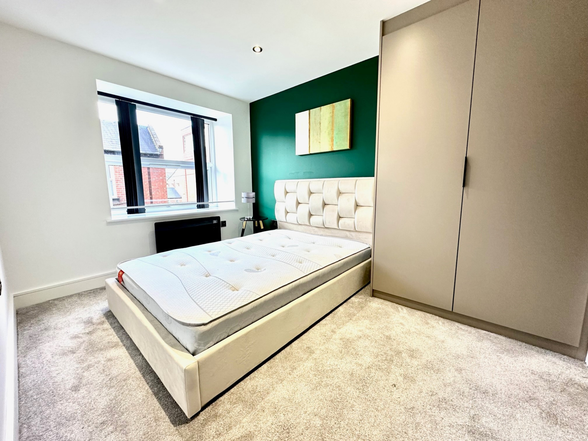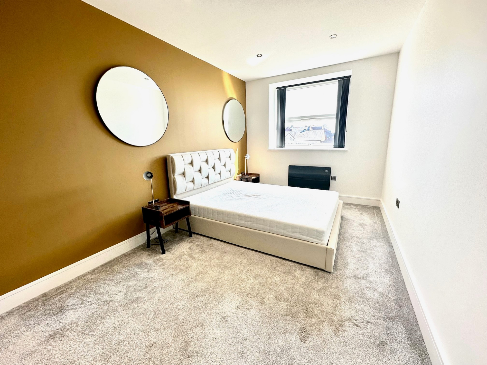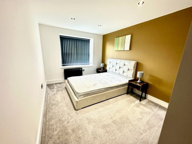 Double bedroom, luxury carpet, double glazed soundproof windows, electric heating, various power points sockets, black chrome finished switches and modern lighting.