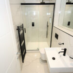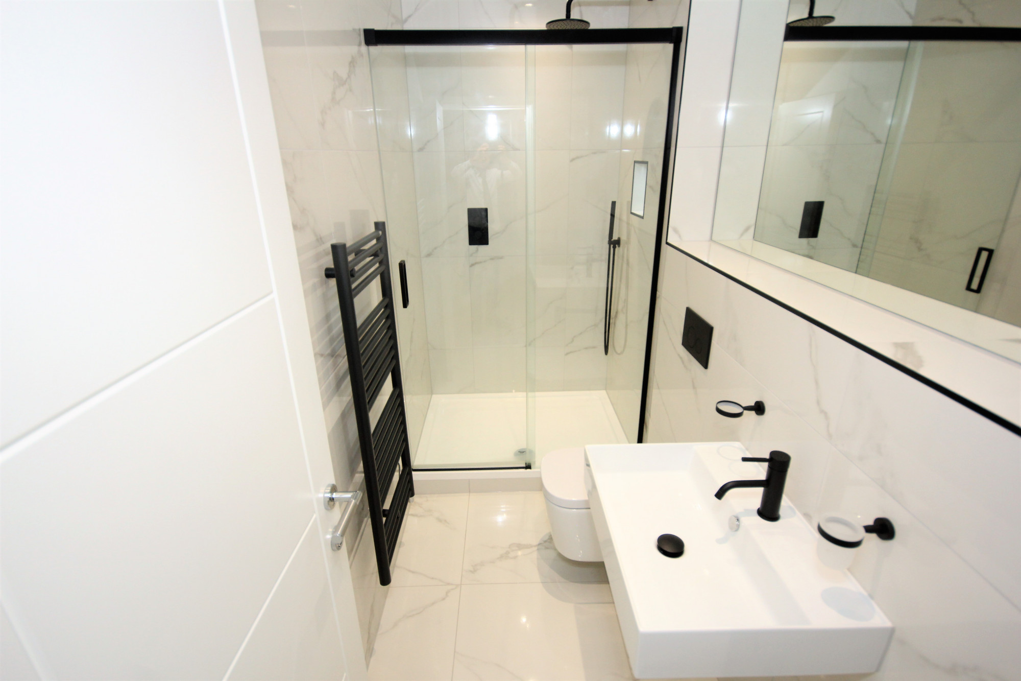 Designer bathroom with W/C, black and white designer shower screen and walk-in in shower, Spanish effect marble tiles throughout, hand basin with vanity unit.