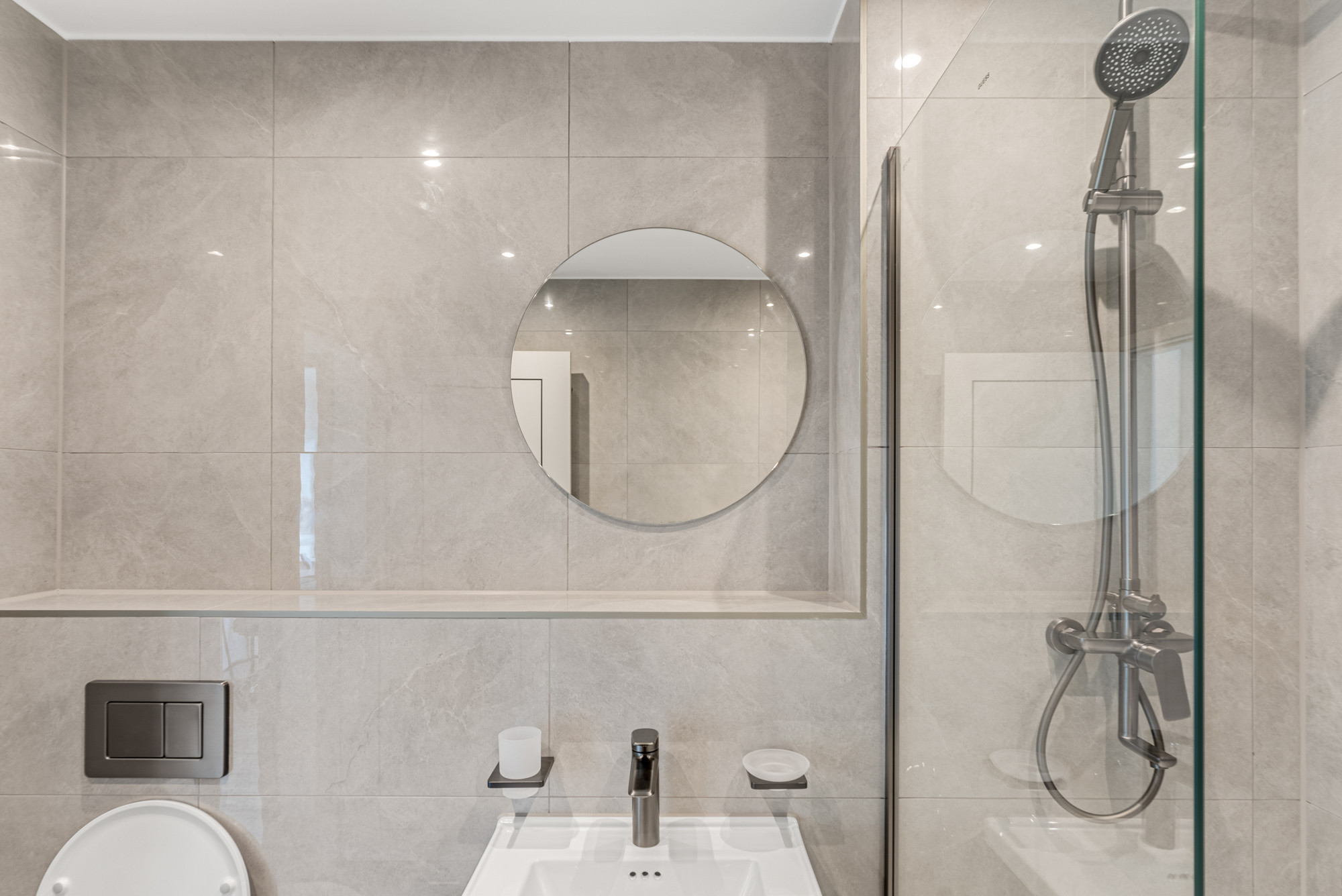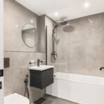 - A contemporary bathroom with a shower over bath, storage vanity unit under the sink, douche kit (shattaf) and a smart electric towel rail heater