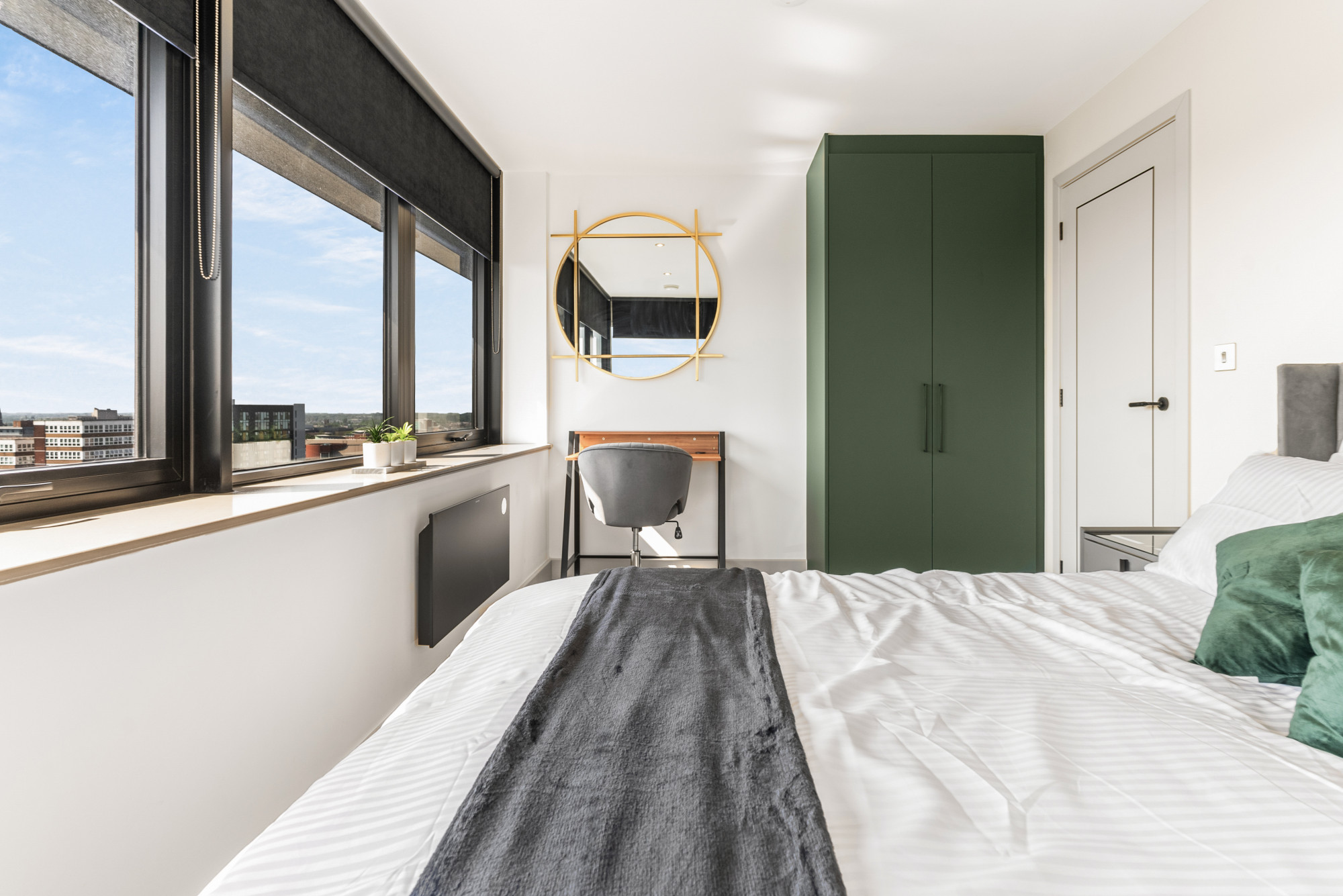- A large double bedroom with a double ottoman bed, mattress, pillows, bedside tables, large fitted wardrobe, study desk with storage and a desk chair