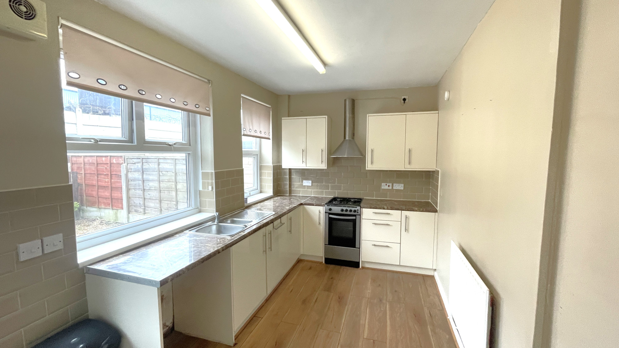 A fitted kitchen with base and wall units, laminate flooring, double glazed window, space for fridge and washing machine, and access to the rear yard.