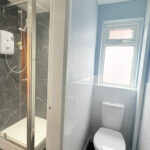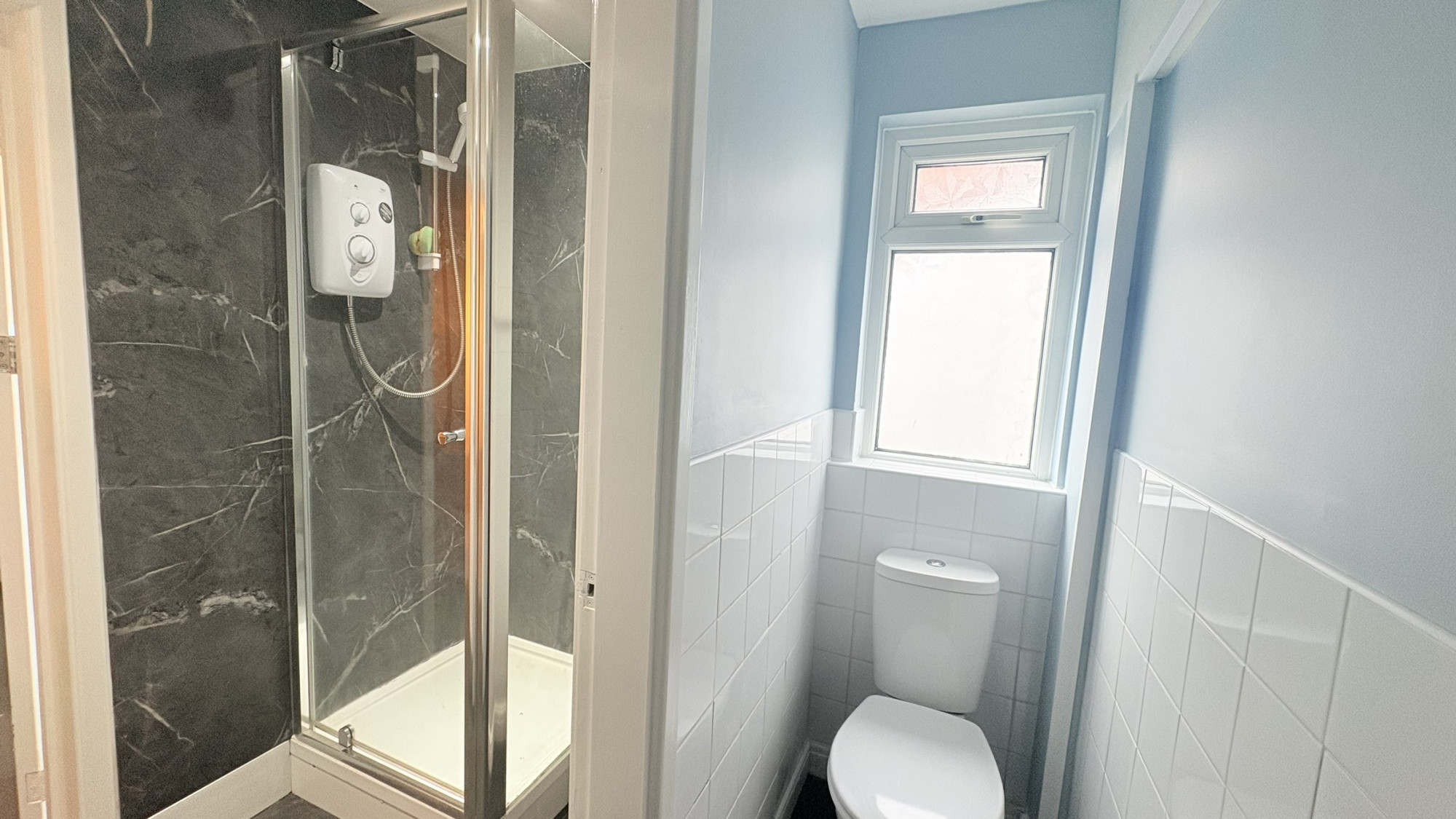 The kitchen is equipped with fitted units, offering ample storage and workspace for everyday cooking needs. The bathroom includes a toilet and shower, finished in a clean and practical style.