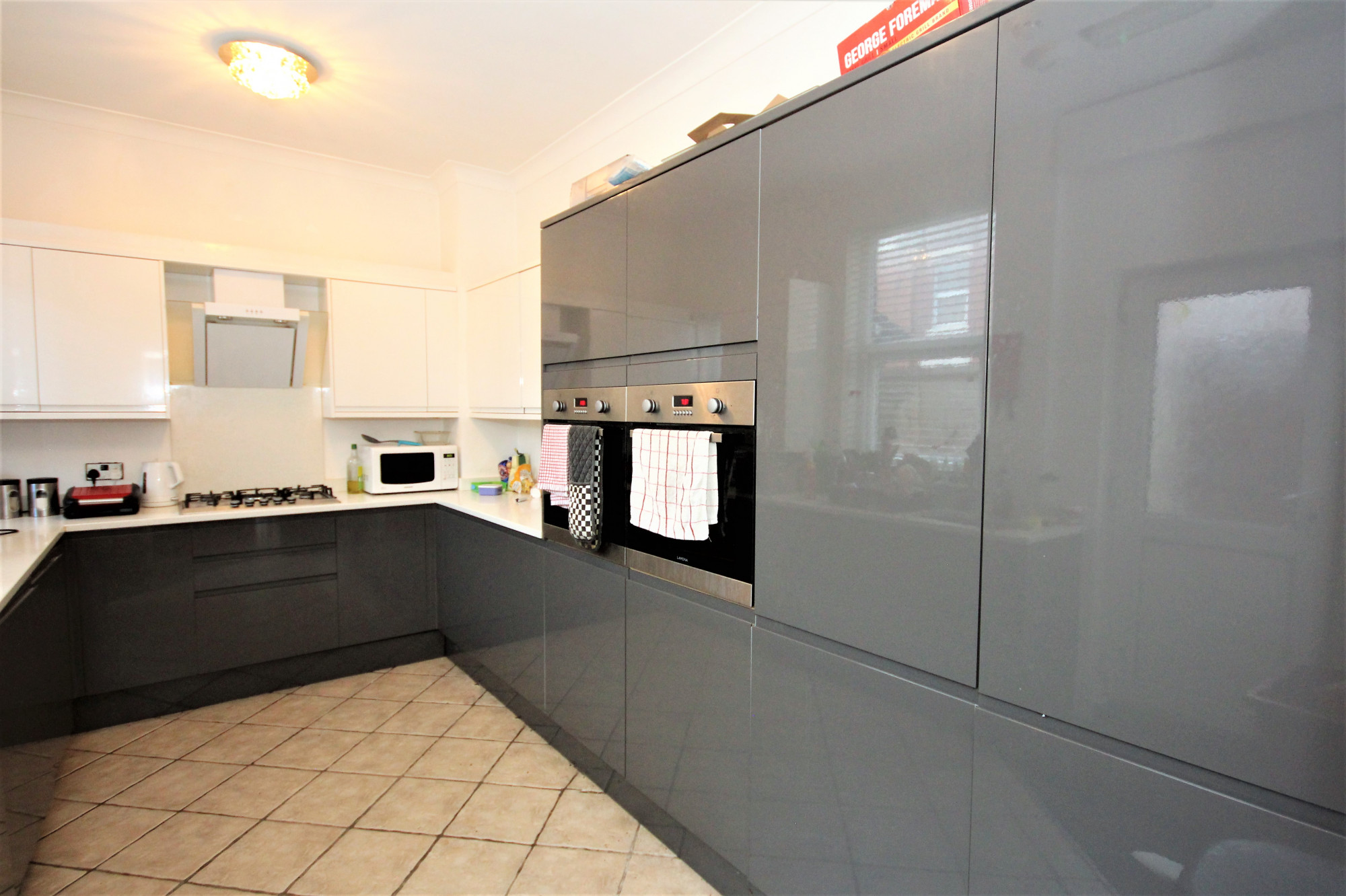 Fully fitted kitchen with integrated goods such as x2 fridge freezers, x2 electric ovens, gas operated fitted stove a washing machine and tumble dryer.