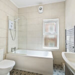 Ground floor bathroom with a overhead shower, W/C and washing basin.
