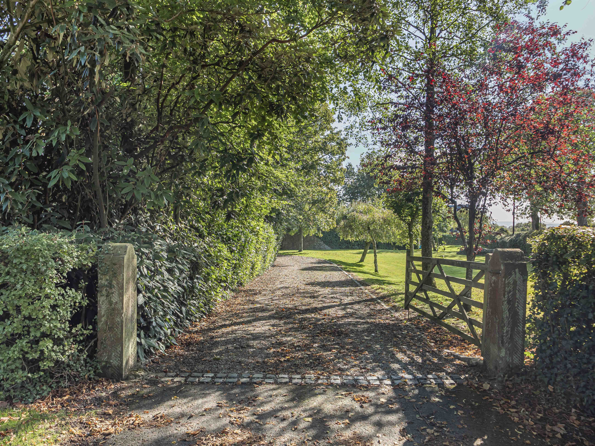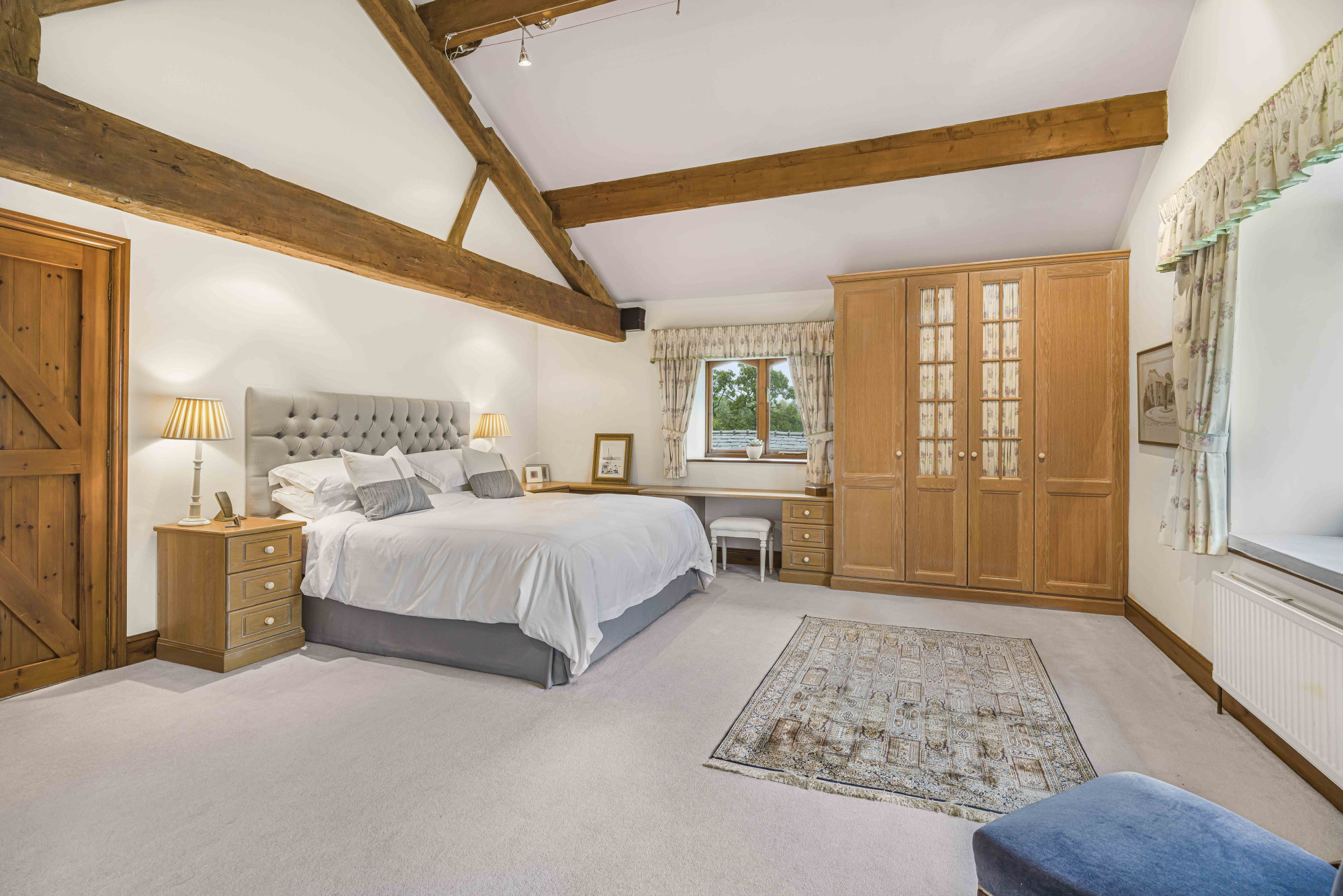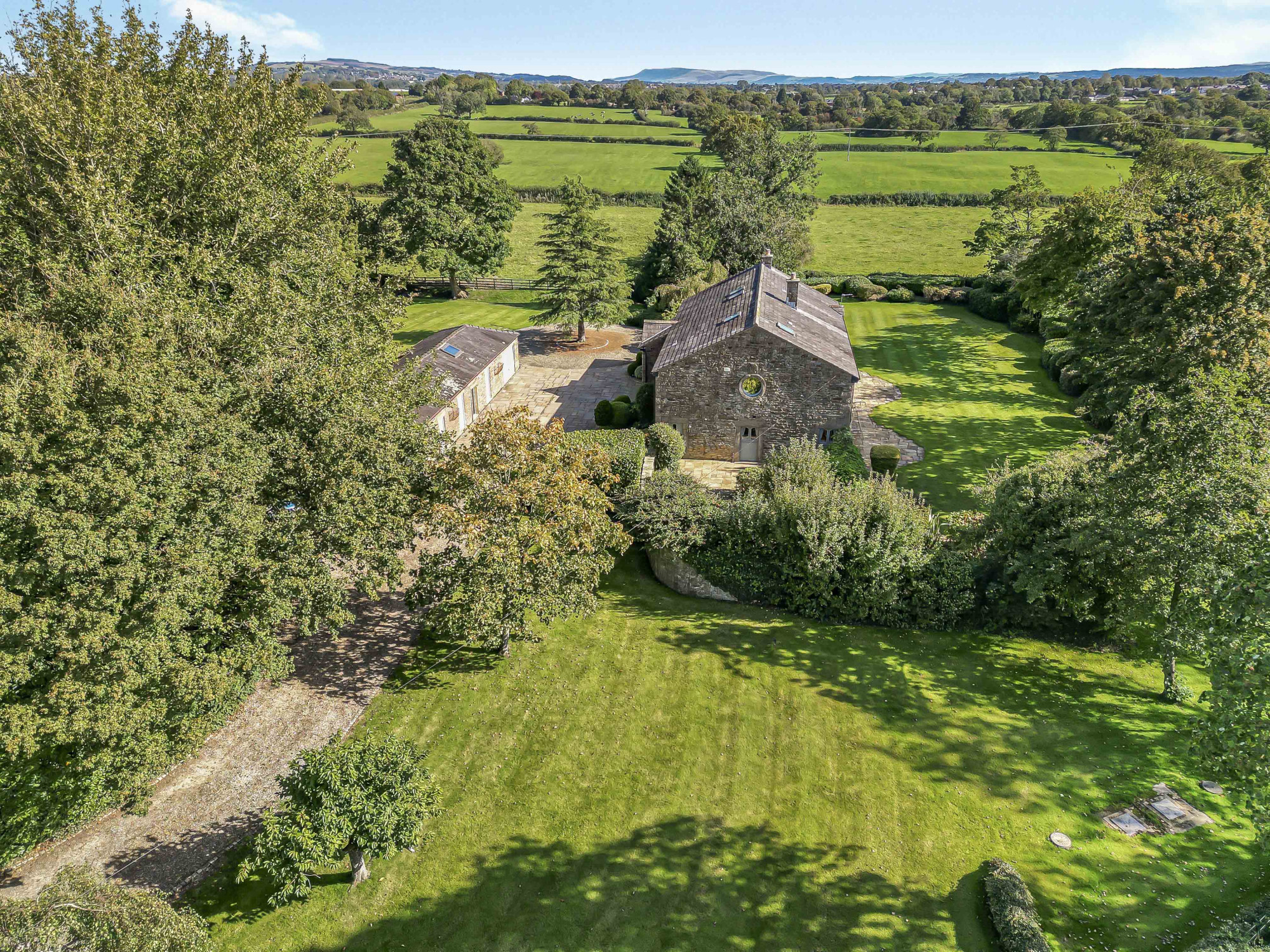 The five bedrooms are all well proportioned, with the principal suite featuring an en‑suite and enjoying far‑reaching views across the grounds and open countryside.