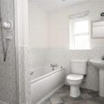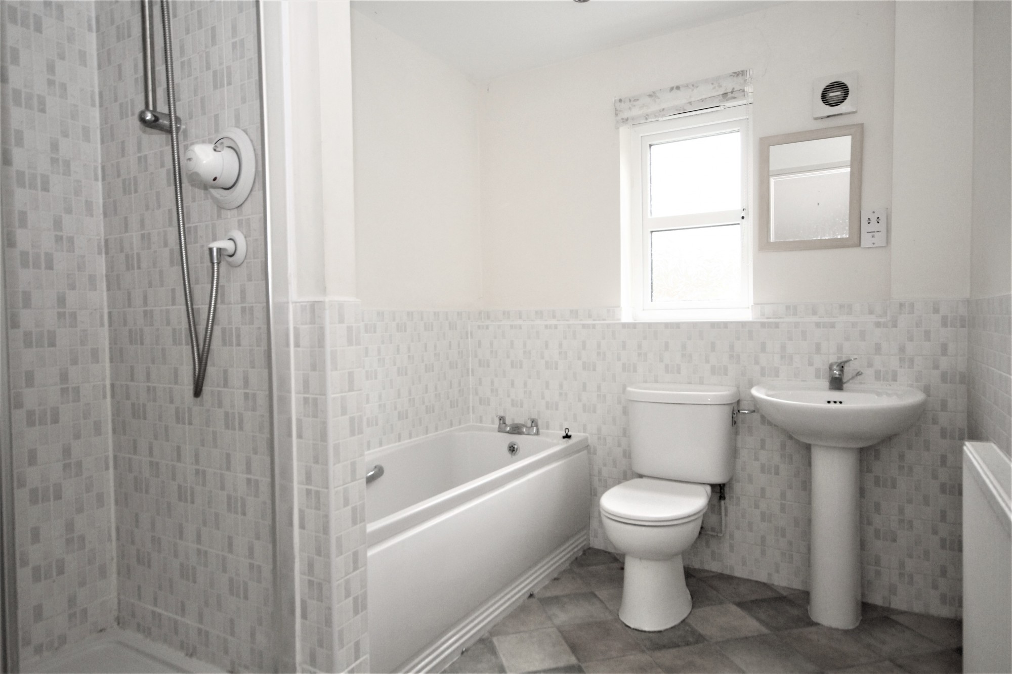 Fully tiled, bathtub with shower, W/C and hand basin.