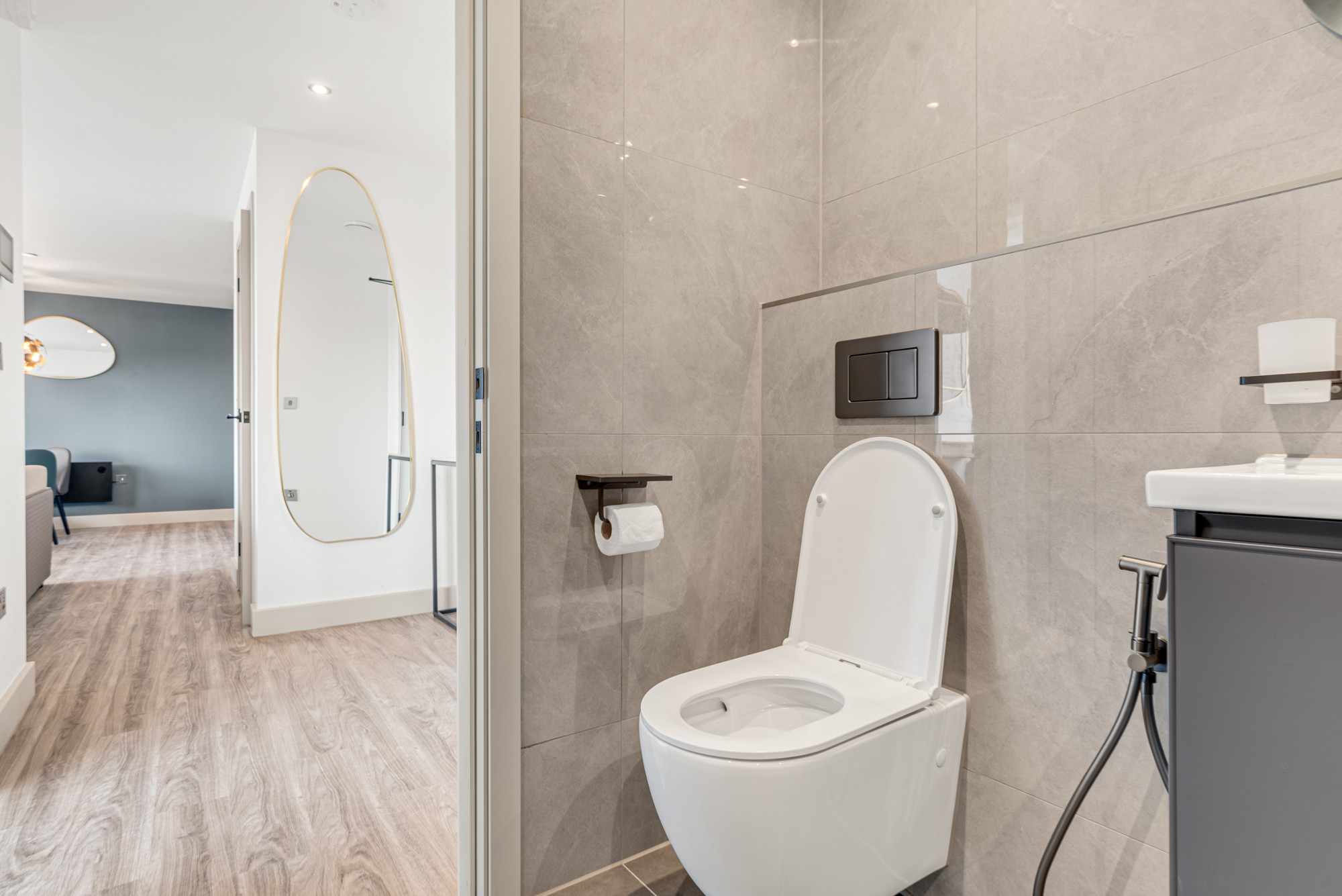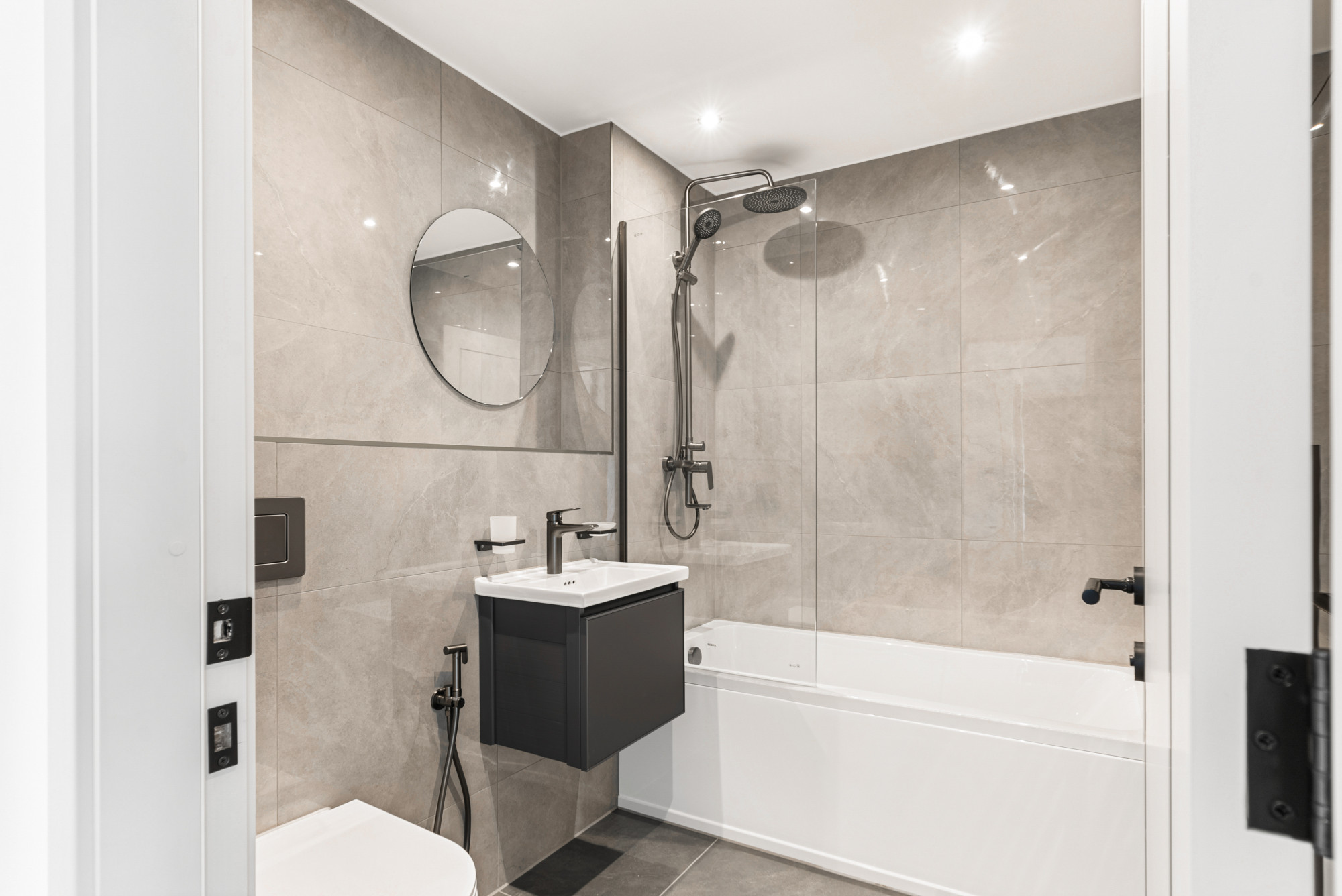 • A contemporary bathroom with a shower over bath, storage vanity unit under the sink, douche kit (shattaf) and a smart electric towel rail