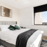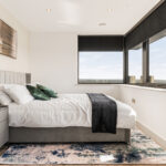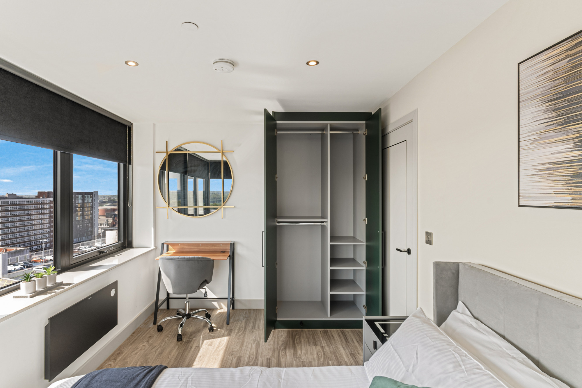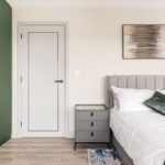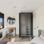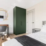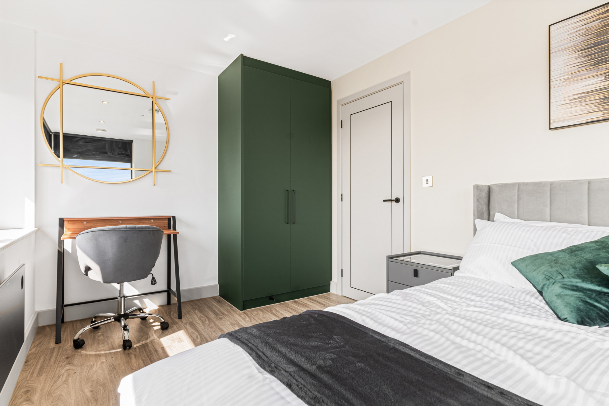 • A large double bedroom with a double bed, mattress, pillows, bedside tables, large fitted wardrobe, study desk with storage and a desk chair