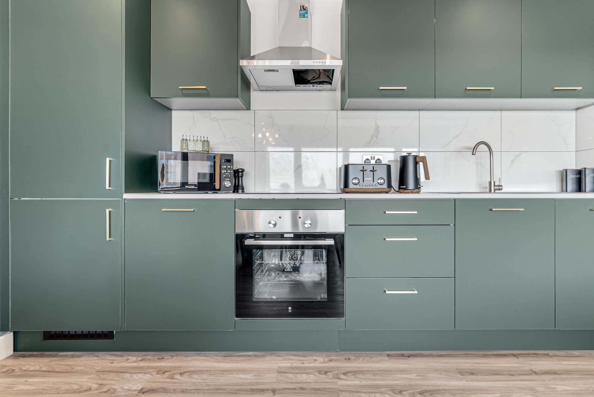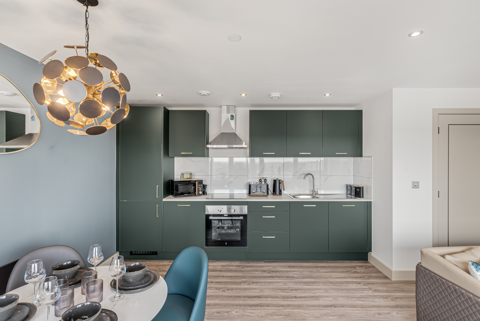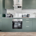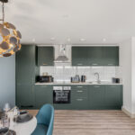 • A sleek, fully fitted kitchen with integrated appliances including oven, hob, fridge/freezer, and washer/dryer