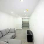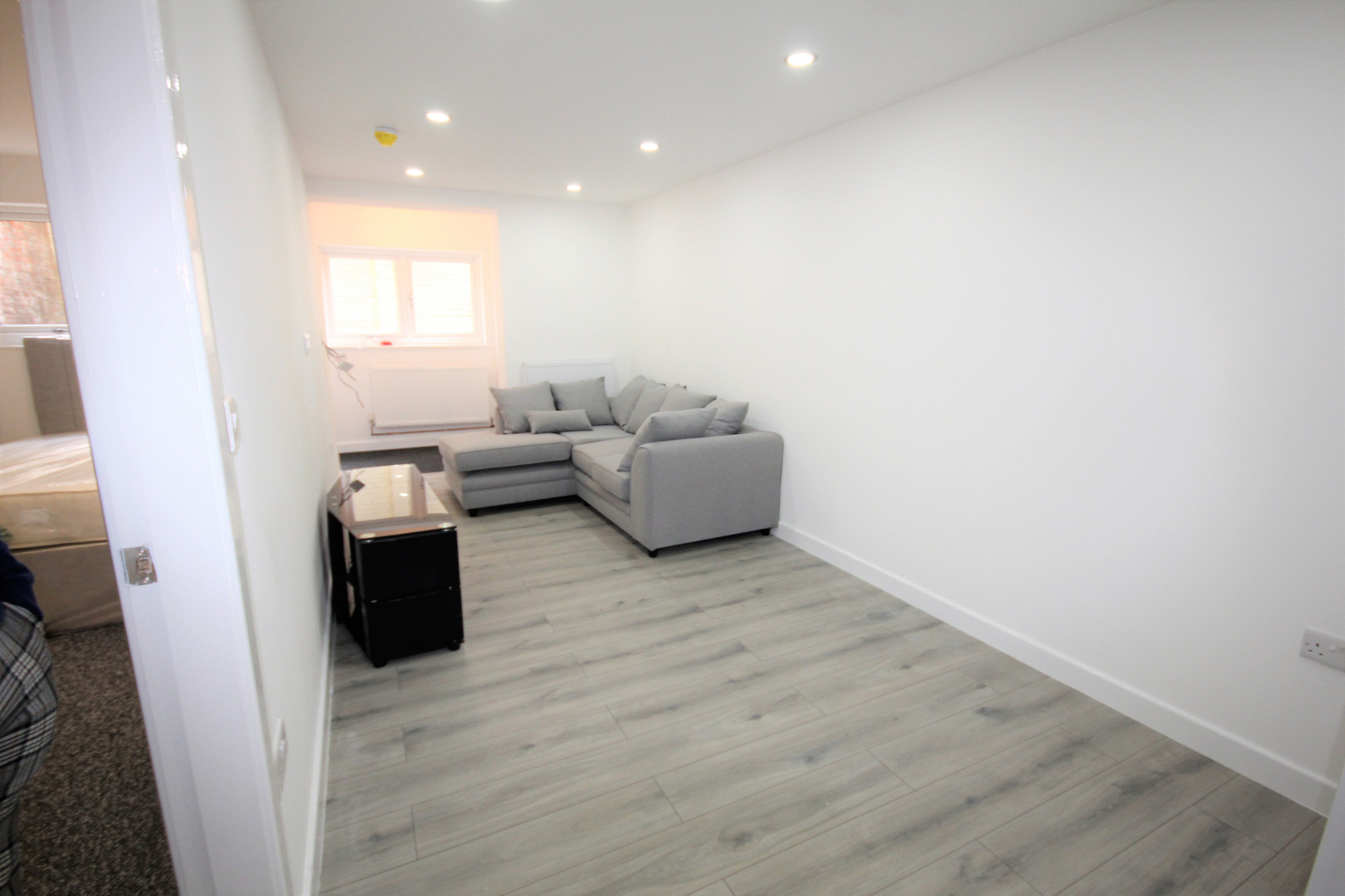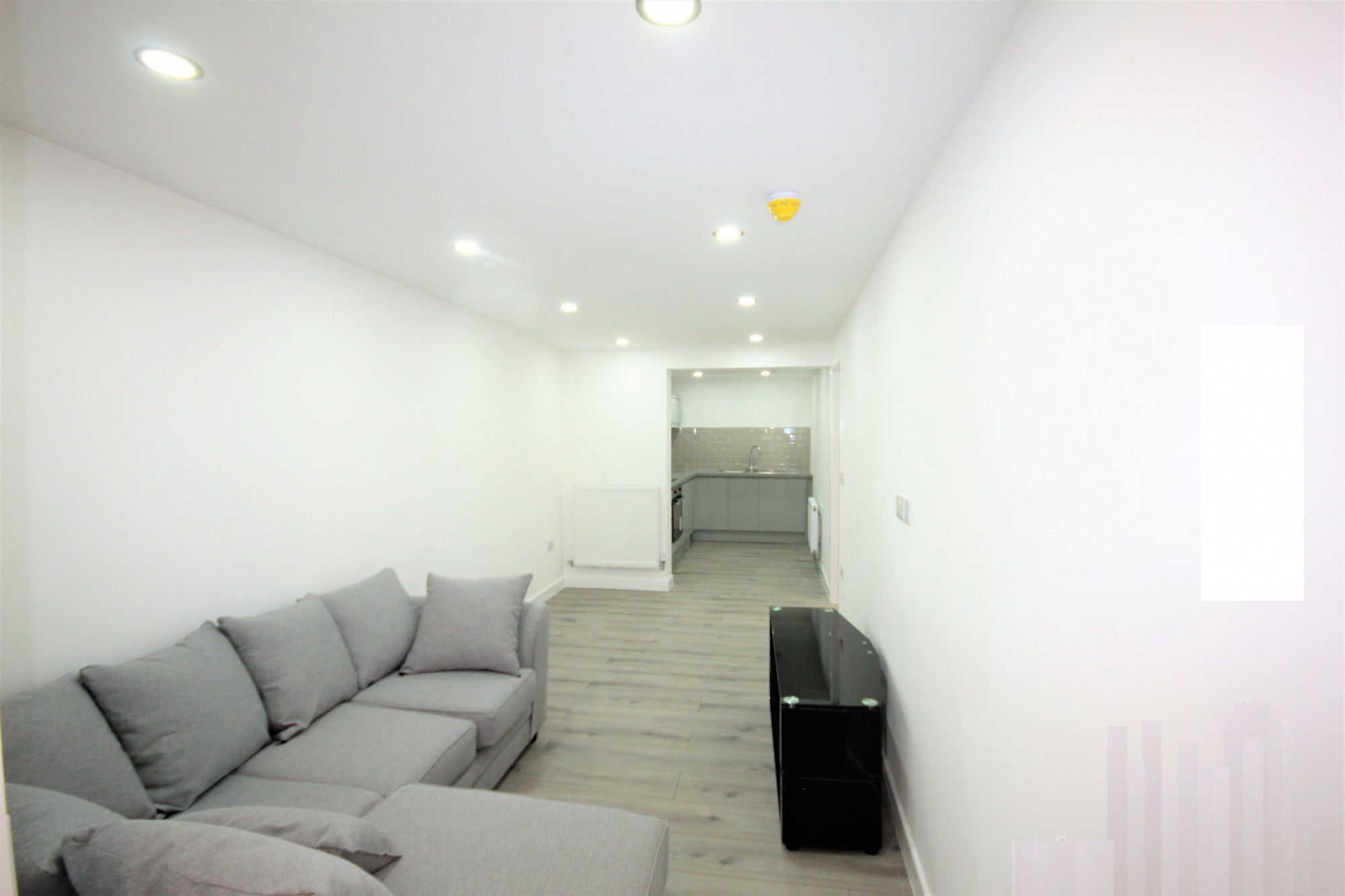 Living area consist of painted wall, spot lighting, power points, tv ariel, L shaped sofa and tv stand..