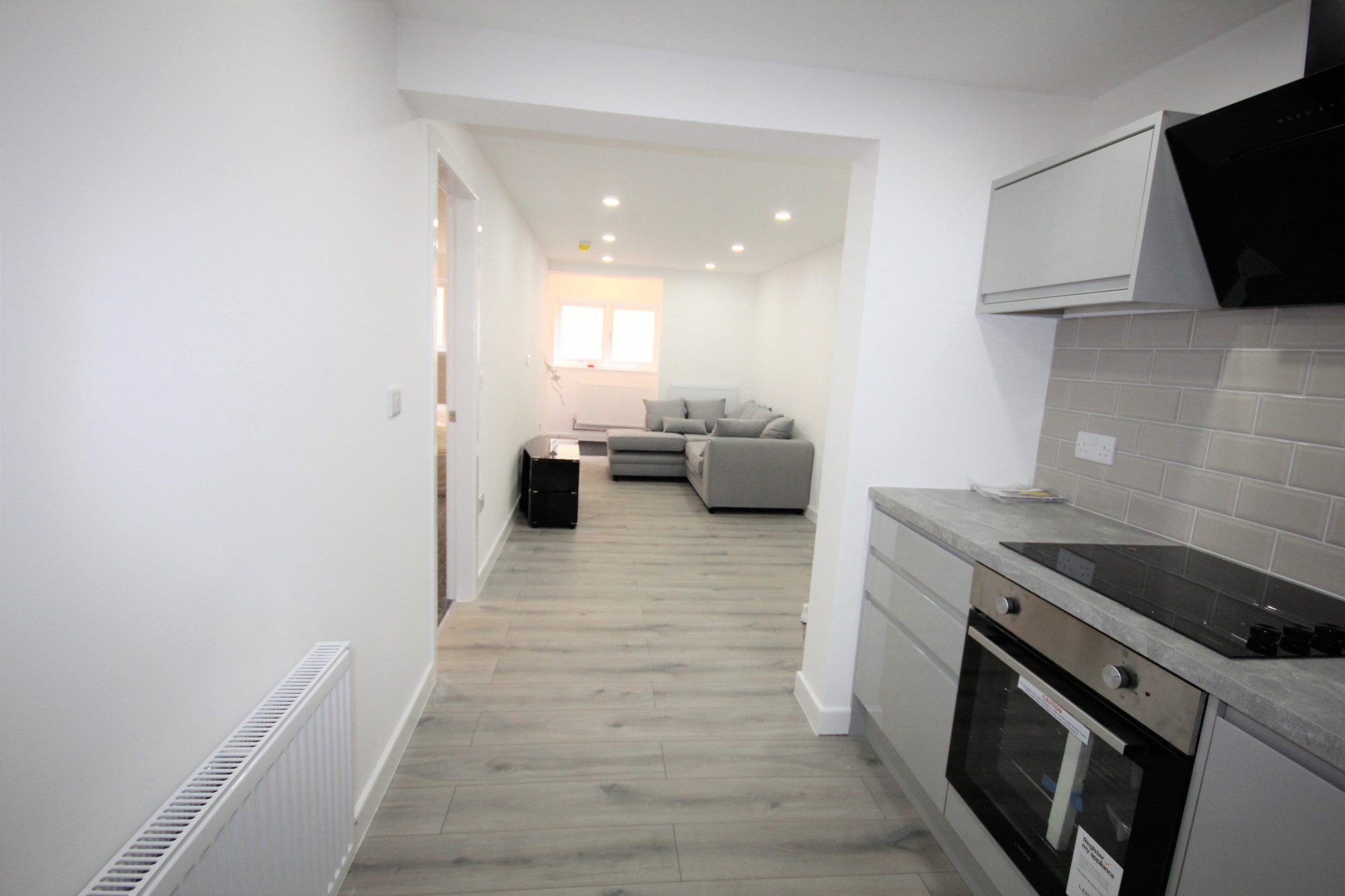 Kitchen area has wall and base gloss grey units with handless doors, tiled splashbacks, contrasting worktops, spot lighting, painted walls, integrated electric hob and oven and built in fridge freezer.