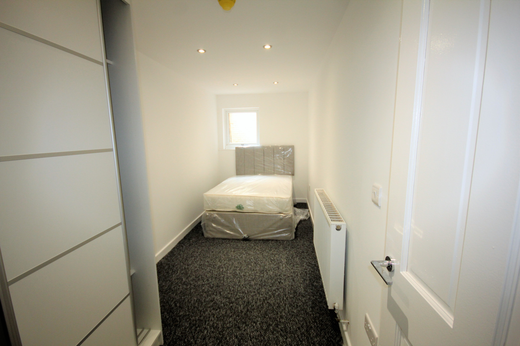 The large double bedroom consist of double bed, painted walls, spot lights, built in wardrobe and access to the bathroom.