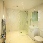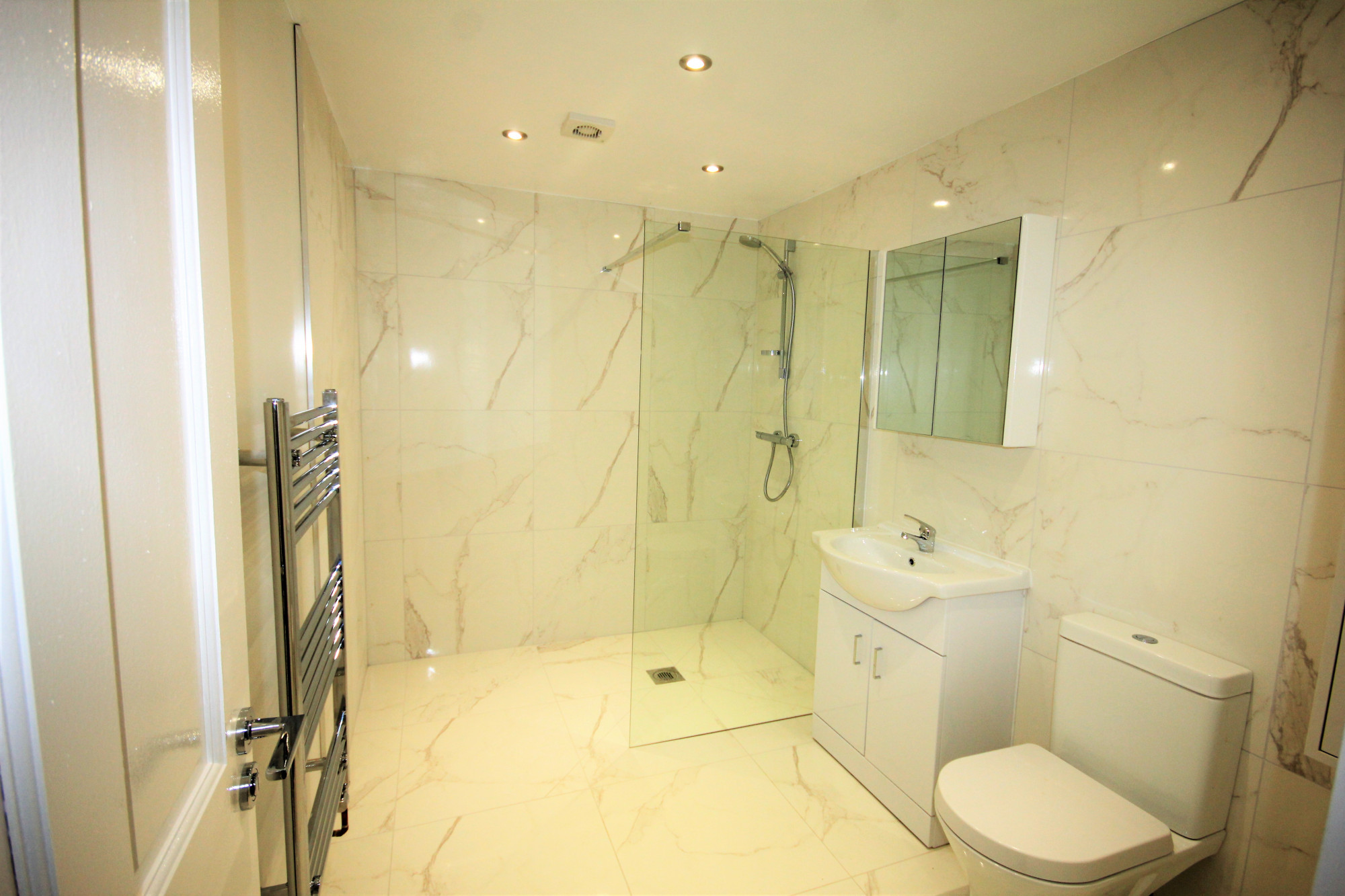 Bathroom includes a well designed and very spacious bathroom having full wall and floor porcelain tiles, low level w/c, has basin with vanity units, hanging mirror and storage and a walk in showers with over head shower and glass screen and towel radiator.