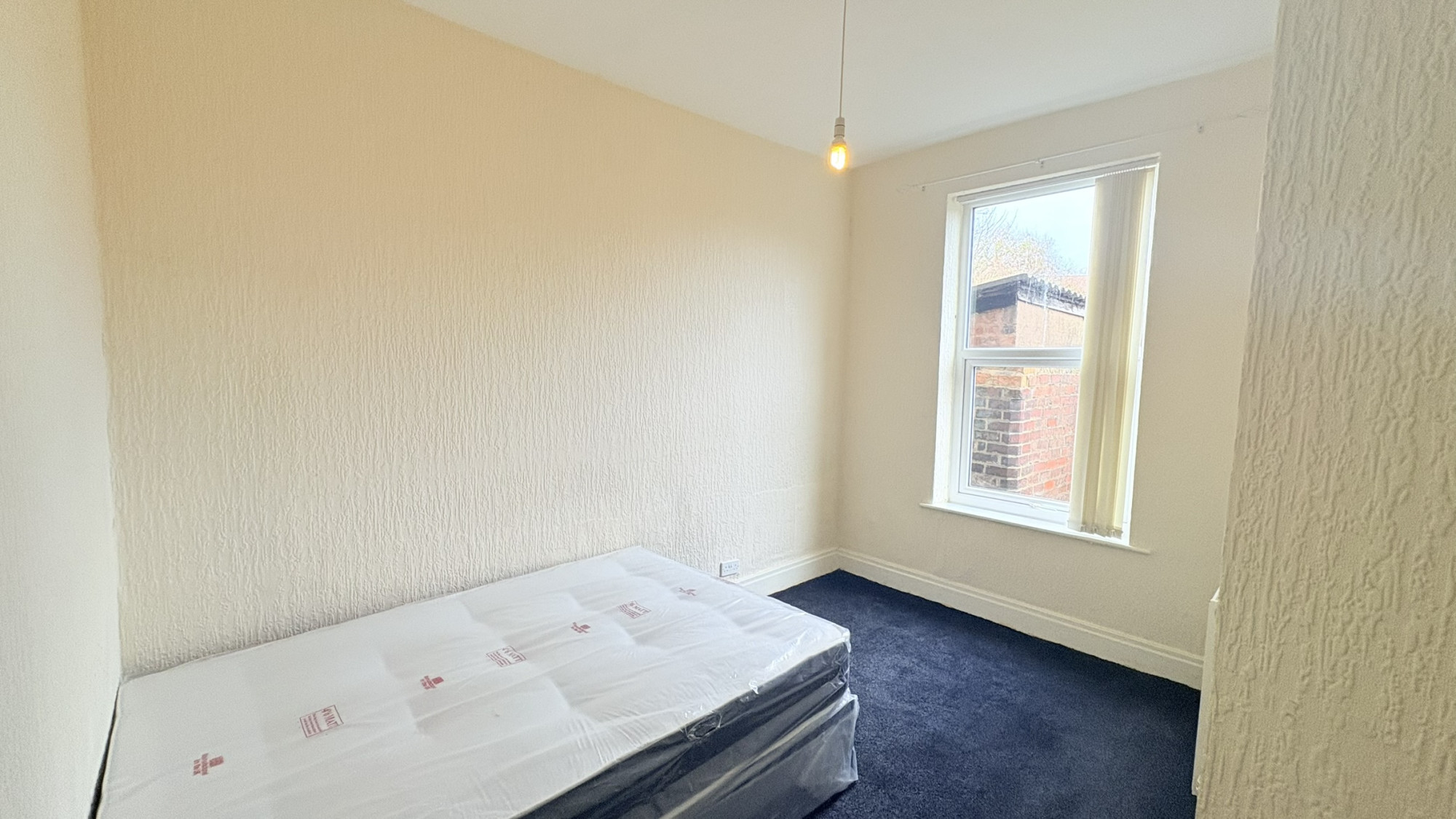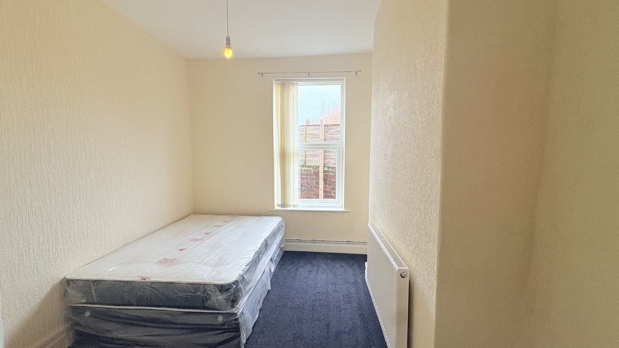 Bedroom one features a carpeted floor, double glazed window and wall mounted radiator.