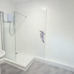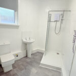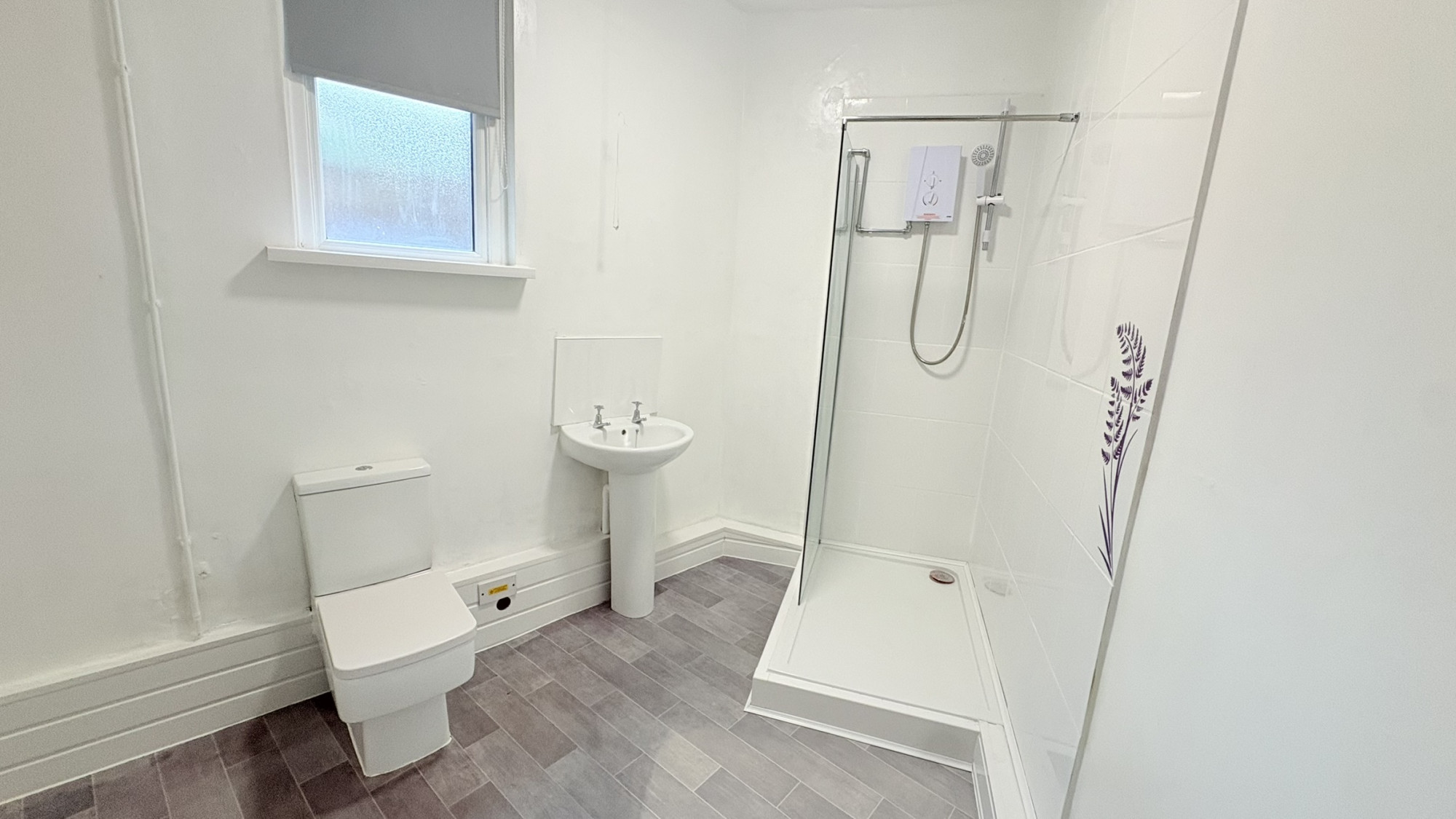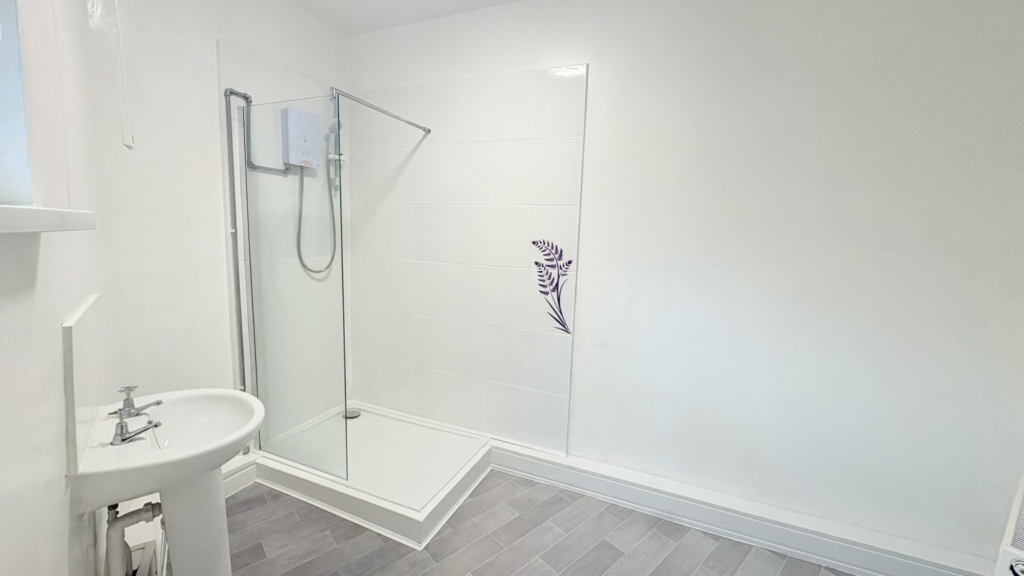 The bathroom features vinyl flooring and includes a hand basin, toilet and shower.