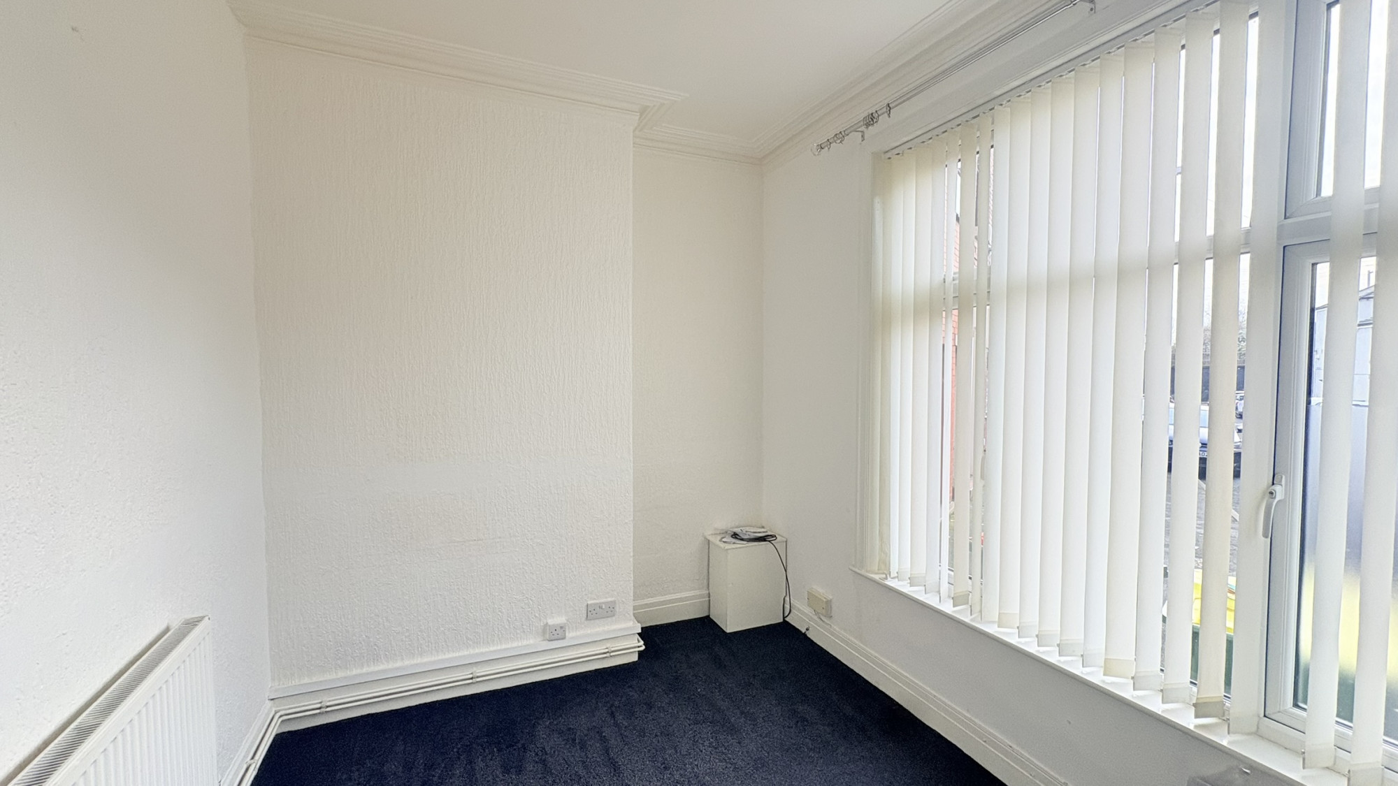 The lounge features a carpeted floor, double glazed window allowing natural light into the room, and a wall mounted radiator.