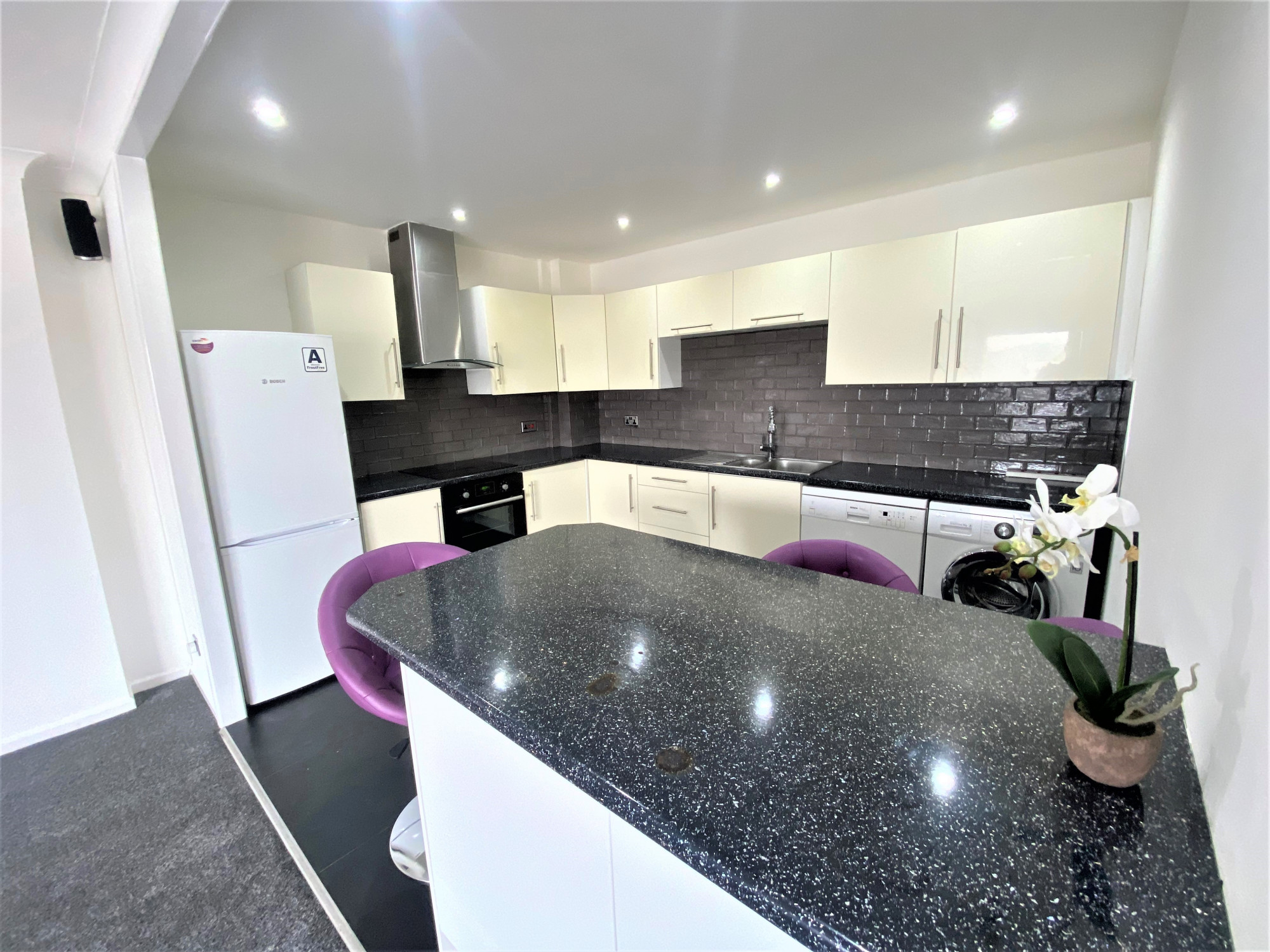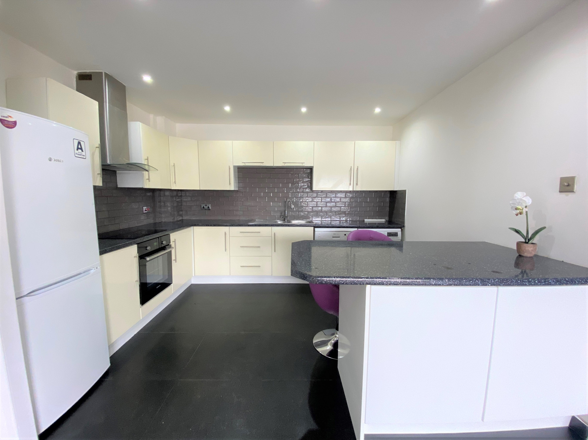 There is a modern gloss white kitchen, complemented by a black gloss work surface. Space for fridge, freezer, washing machine and dishwasher. Oven with grill and electric hob, spot light and tiled floor.