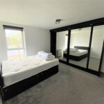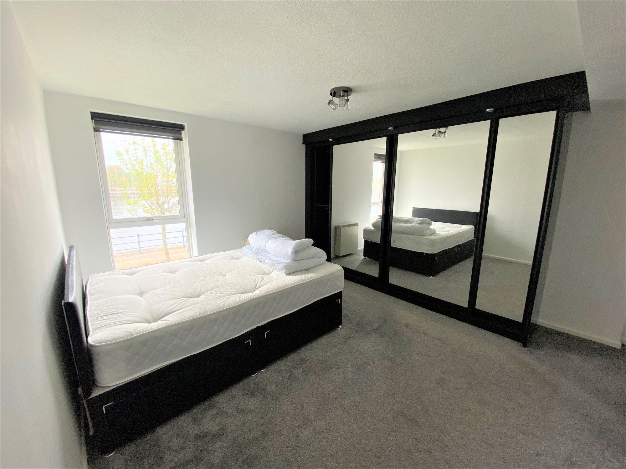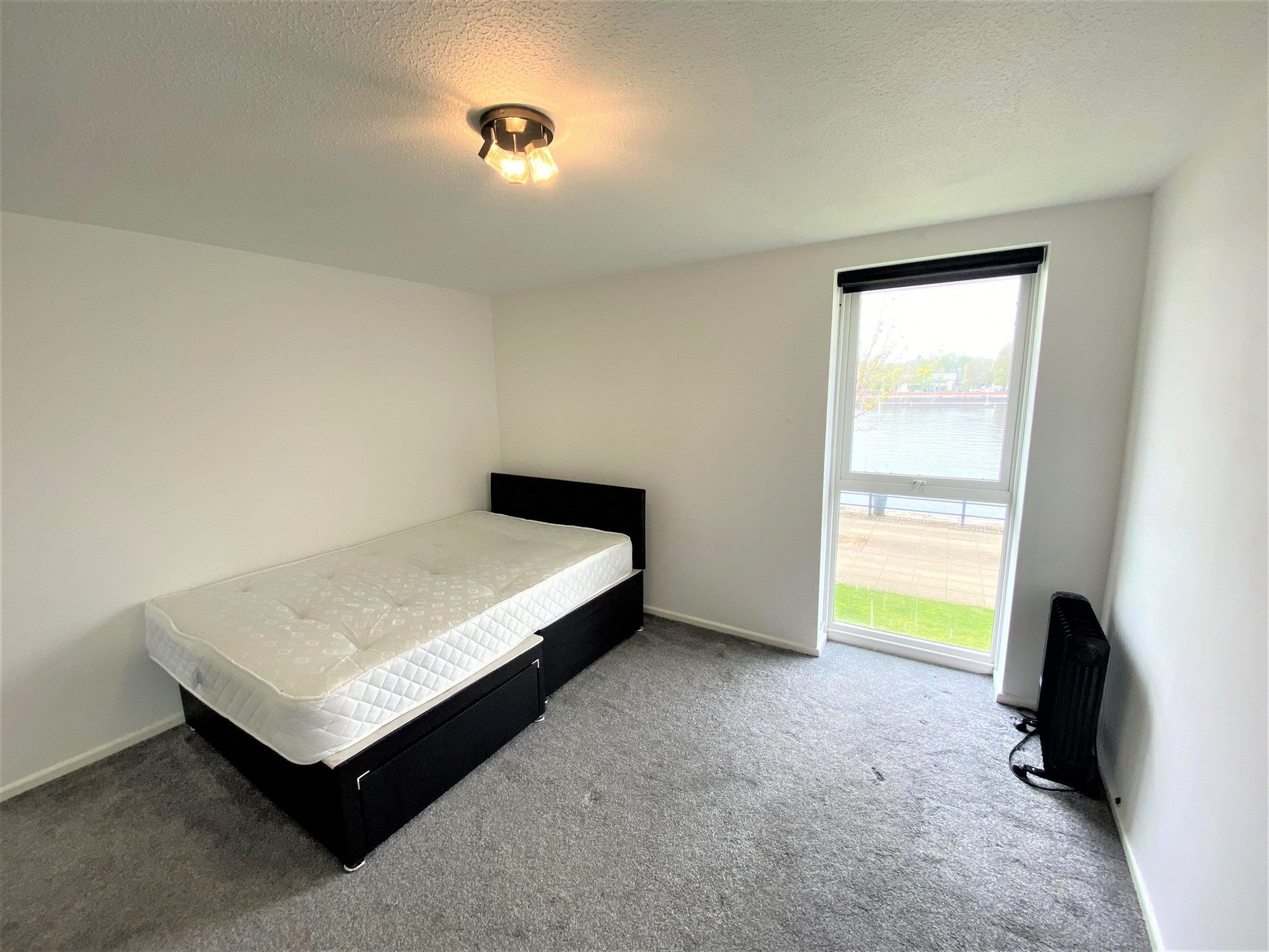 The 2nd bedroom is a good sized double bedroom including a built in wardrobe, carpet, painted walls, electric heater, and a bed provided