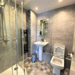 The master bedroom also comes with its own en-suite bathroom which consists of a white W/C and pedestal basin with glass corner shower cubicle with an electric shower fully tiled walls and floor.